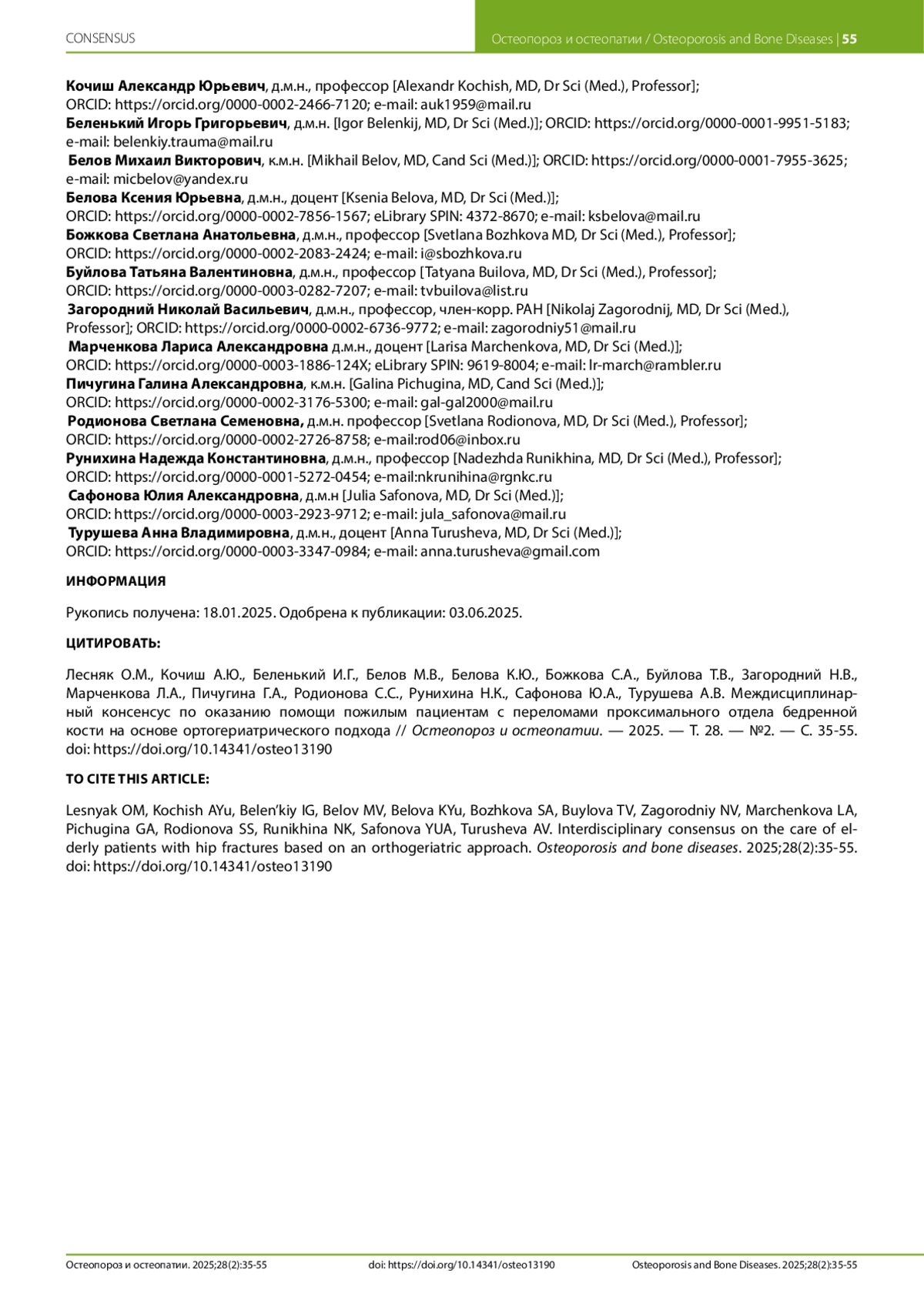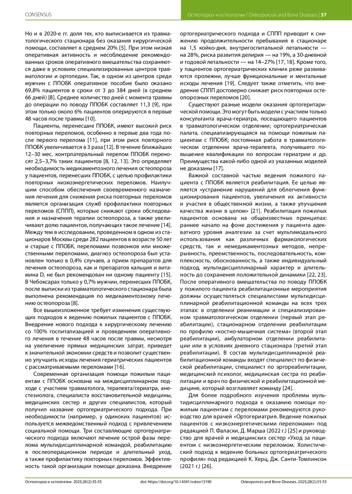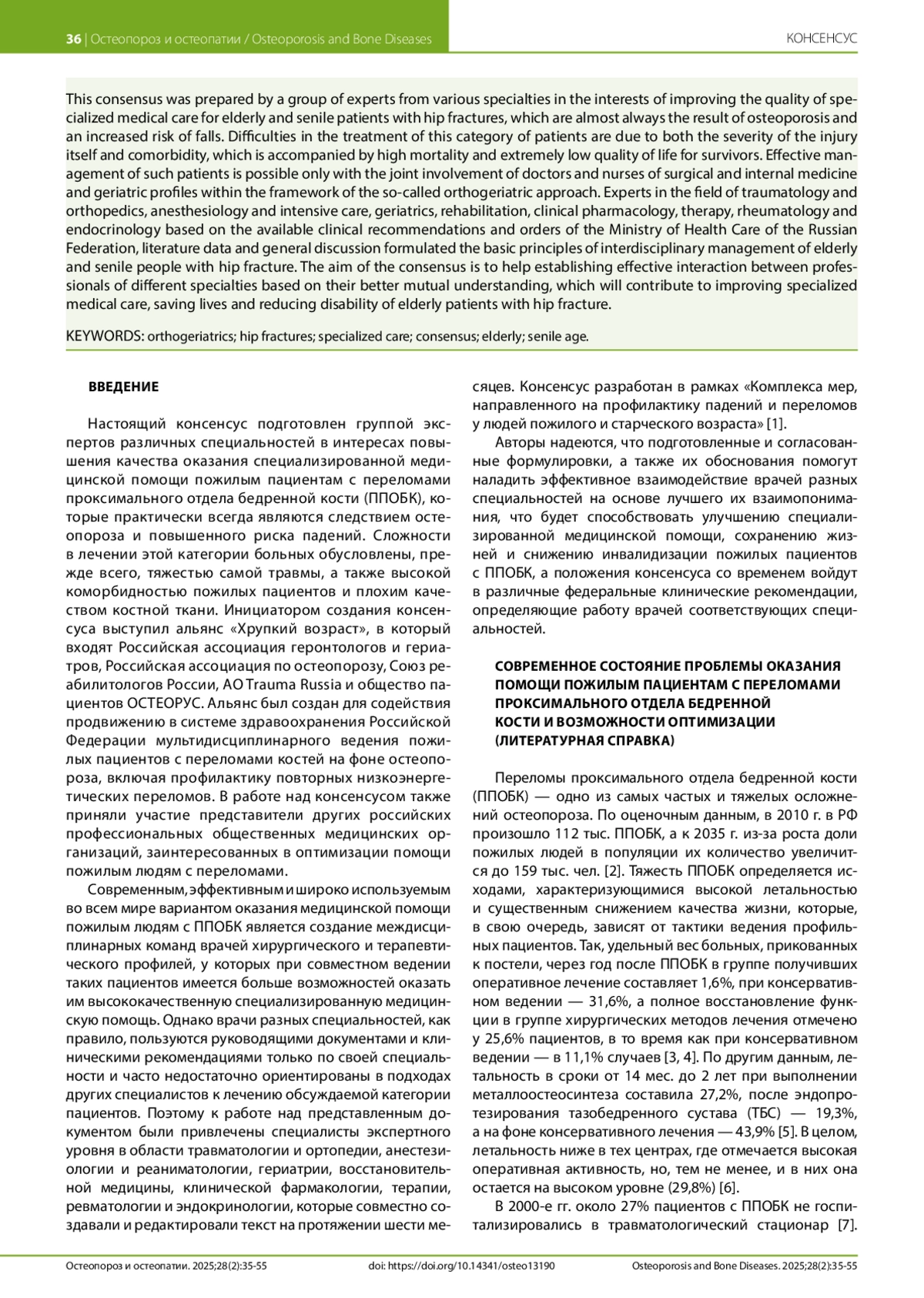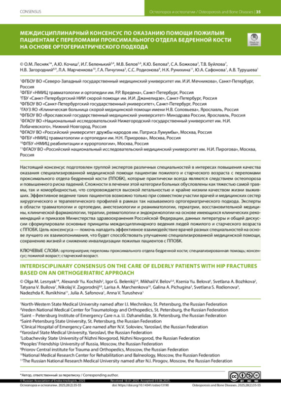 Настоящий консенсус подготовлен группой экспертов различных специальностей в интересах повышения качества оказания специализированной медицинской помощи пациентам пожилого и старческого возраста с переломами проксимального отдела бедренной кости (ППОБК), которые практически всегда являются следствием остеопороза и повышенного риска падений. Сложности в лечении этой категории больных обусловлены как тяжестью самой травмы, так и коморбидностью, что сопровождается высокой летальностью и крайне низким качеством жизни выживших. Эффективное ведение таких пациентов возможно только при совместном участии врачей и медицинских сестер хирургического и терапевтического профилей в рамках так называемого ортогериатрического подхода. Эксперты в области травматологии и ортопедии, анестезиологии и реаниматологии, гериатрии, восстановительной медицины, клинической фармакологии, терапии, ревматологии и эндокринологии на основе имеющихся клинических рекомендаций и приказов Министерства здравоохранения Российской Федерации, данных литературы и общей дискуссии сформулировали основные принципы междисциплинарного ведения людей пожилого и старческого возраста с ППОБК. Цель консенсуса — помочь наладить эффективное взаимодействие врачей разных специальностей на основе лучшего их взаимопонимания, что будет способствовать улучшению специализированной медицинской помощи, сохранению жизней и снижению инвалидизации пожилых пациентов с ППОБК.