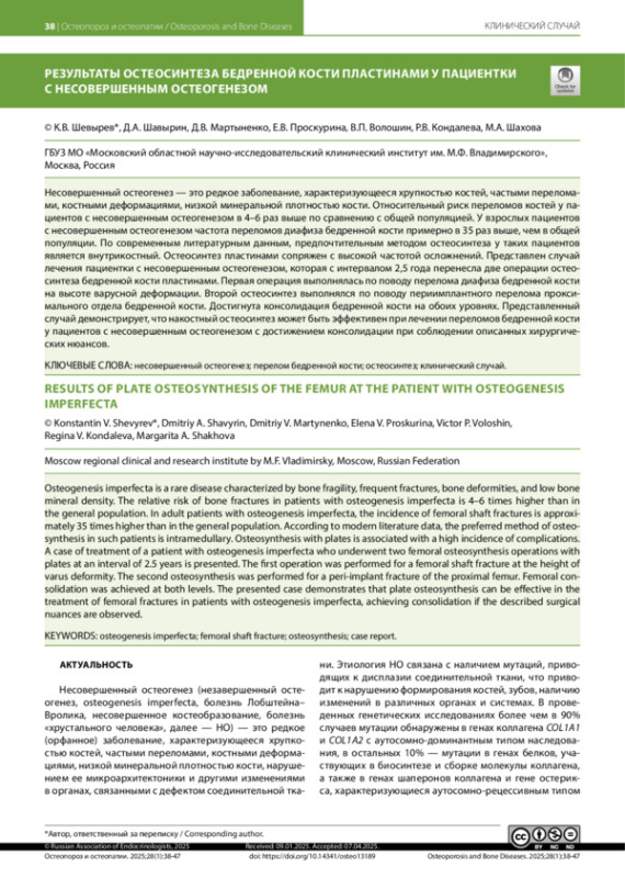 ШЕВЫРЕВ К. В., ШАВЫРИН Д. А., МАРТЫНЕНКО Д. В., ПРОСКУРИНА Е. В., ВОЛОШИН В. П., КОНДАЛЕВА Р. В., ШАХОВА М. А. РЕЗУЛЬТАТЫ ОСТЕОСИНТЕЗА БЕДРЕННОЙ КОСТИ ПЛАСТИНАМИ У ПАЦИЕНТКИ С НЕСОВЕРШЕННЫМ ОСТЕОГЕНЕЗОМ // ОСТЕОПОРОЗ И ОСТЕОПАТИИ. 2025. № 1, ТОМ 28