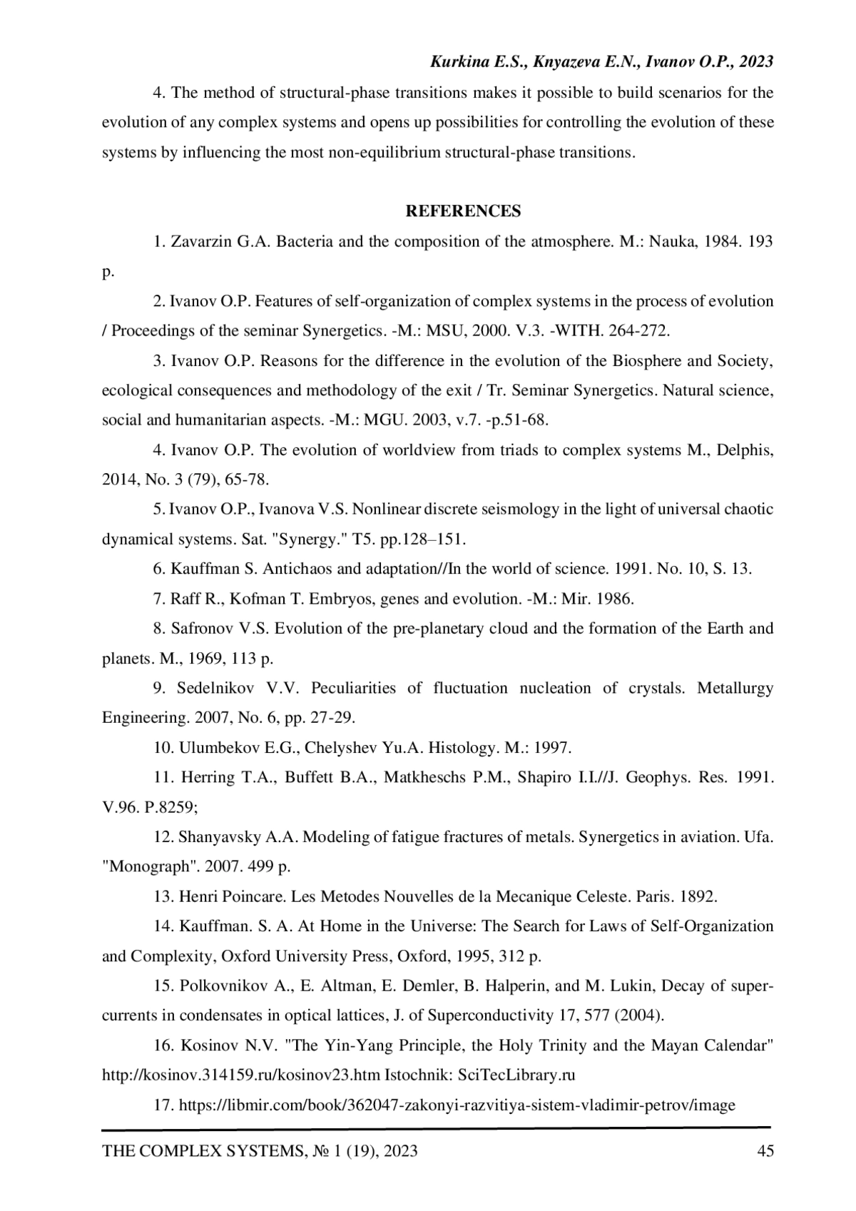 2. Ivanov O.P. Features of self-organization of complex systems in the process of evolution/ Proceedings of the seminar Synergetics. -M.: MSU, 2000. V.3. -WITH. 264-272.