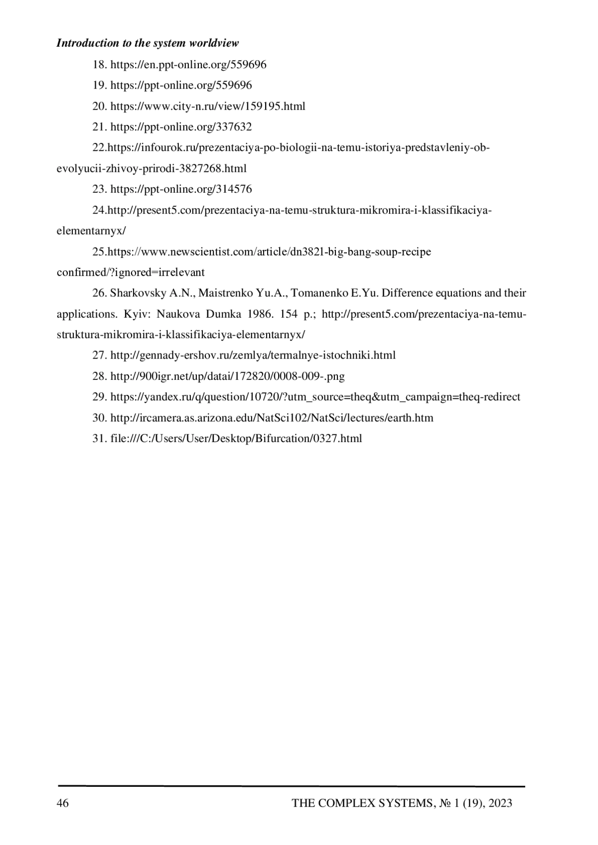 26. Sharkovsky A.N., Maistrenko Yu.A., Tomanenko E.Yu. Difference equations and their applications. Kyiv: Naukova Dumka 1986. 154 p.; http://present5.com/prezentaciya-na-temu-struktura-mikromira-i-klassifikaciya-elementarnyx/