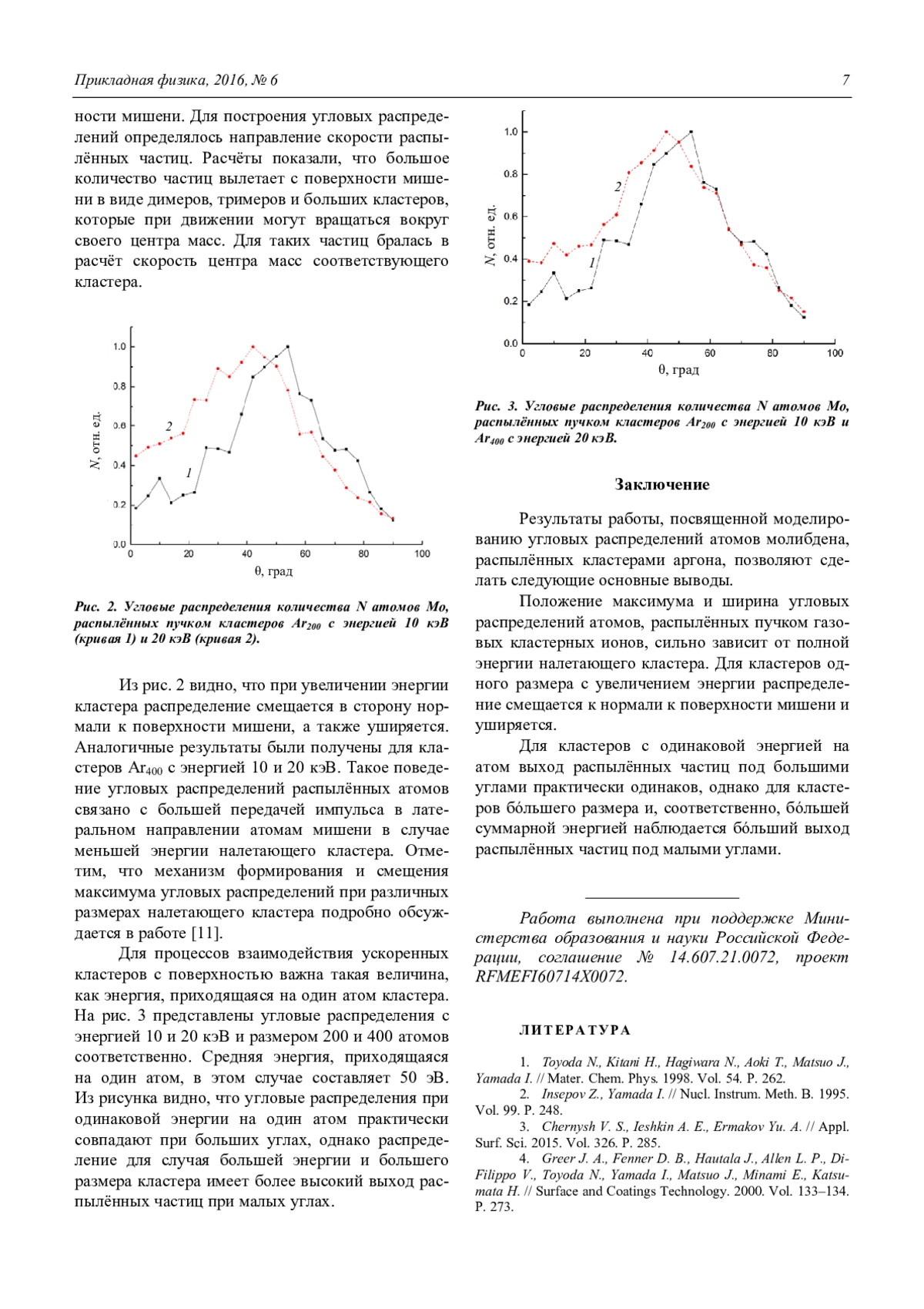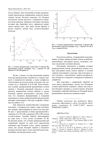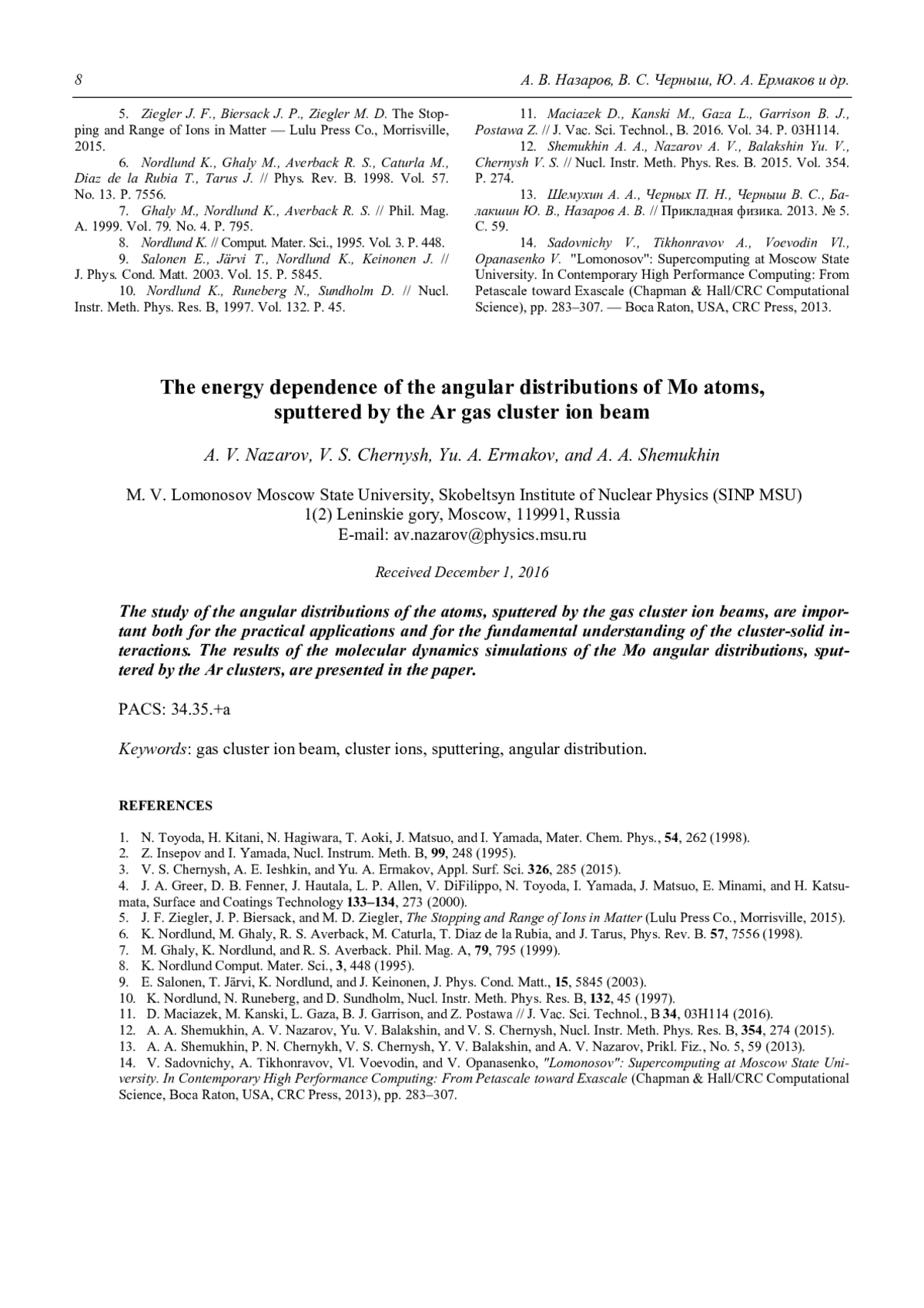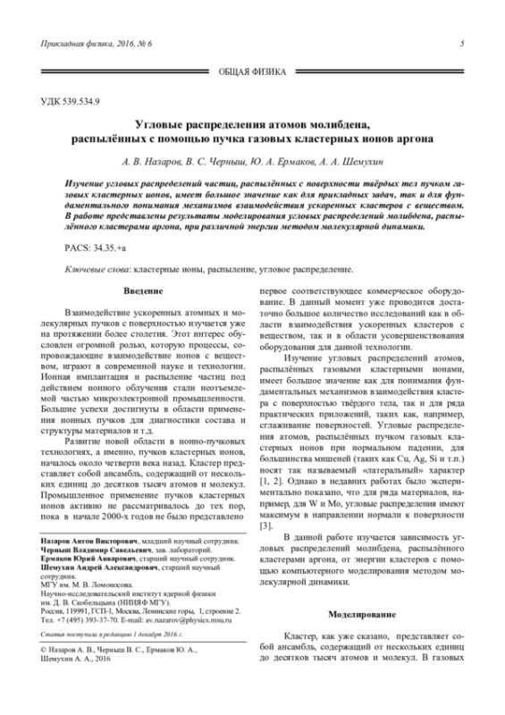 Назаров А. В., Черныш В. С., Ермаков Ю. А., Шемухин А. А. Угловые распределения атомов молибдена, распылённых с помощью пучка газовых кластерных ионов аргона 5