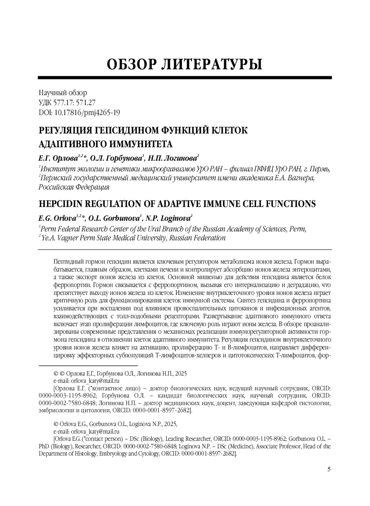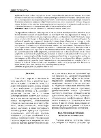 Пептидный гормон гепсидин является ключевым регулятором метаболизма ионов железа. Гормон вырабатывается, главным образом, клетками печени и контролирует абсорбцию ионов железа энтероцитами, а также экспорт ионов железа из клеток. Основной мишенью для действия гепсидина является белок ферропортин. Гормон связывается с ферропортином, вызывая его интернализацию и деградацию, что препятствует выходу ионов железа из клеток. Изменение внутриклеточного уровня ионов железа играет критичную роль для функционирования клеток иммунной системы. Синтез гепсидина и ферропортина усиливается при воспалении под влиянием провоспалительных цитокинов и инфекционных агентов, взаимодействующих с толл-подобными рецепторами. Развертывание адаптивного иммунного ответа включает этап пролиферации лимфоцитов, где ключевую роль играют ионы железа. В обзоре проанализированы современные представления о механизмах реализации иммунорегуляторной активности гормона гепсидина в отношении клеток адаптивного иммунитета. Регуляция гепсидином внутриклеточного уровня ионов железа влияет на активацию, пролиферацию Т- и В-лимфоцитов, направляет дифференцировку эффекторных субпопуляций Т-лимфоцитов-хелперов и цитотоксических Т-лимфоцитов, формирование В-клеток памяти и продукцию антител. Актуальность систематизации знаний о механизмах регуляции метаболизма ионов железа и иммунорегуляторной активности гепсидина определяется широким распространением железодефицитных состояний и популярностью железосодержащих препаратов. Понимание механизмов направленной регуляции метаболизма ионов железа имеет глубокое фундаментальное и практическое значение и открывает новые перспективы для лечения железодефицитных состояний, инфекционных, онкологических, нейродегенеративных заболеваний.