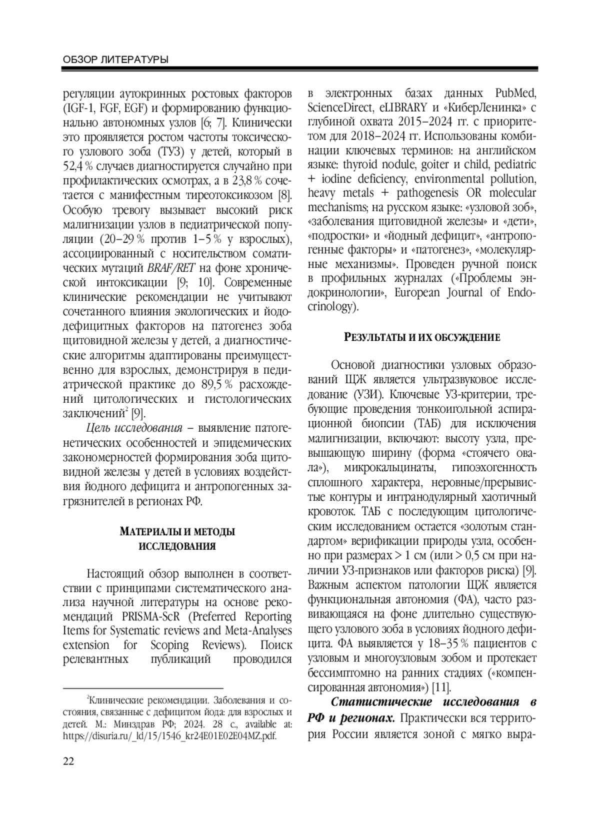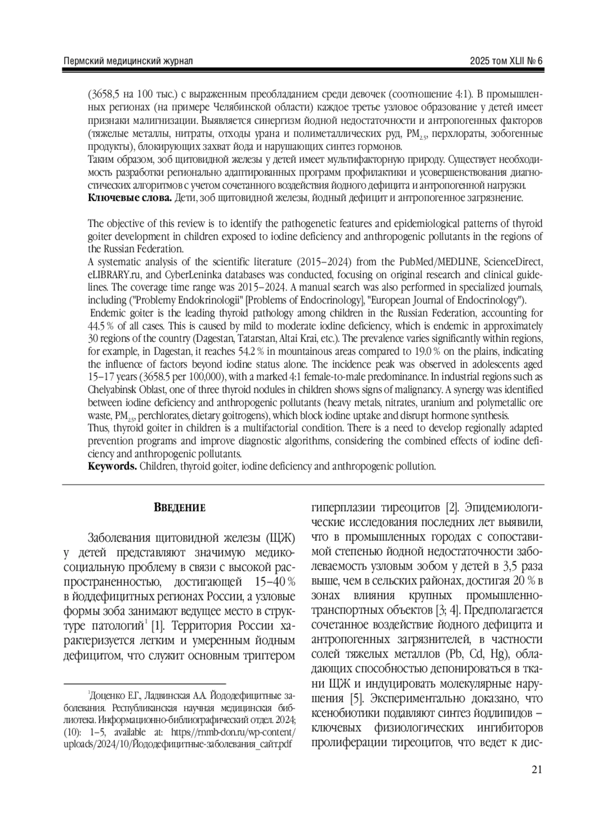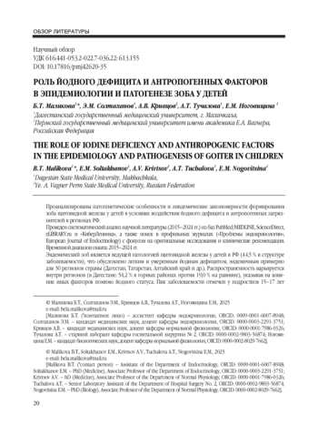 Проанализированы патогенетические особенности и эпидемические закономерности формирования зоба щитовидной железы у детей в условиях воздействия йодного дефицита и антропогенных загрязнителей в регионах РФ. Проведен систематический анализ научной литературы (2015-2024 гг.) из баз PubMed/MEDLINE, ScienceDirect, eLIBRARY. ru и «КиберЛенинка», а также поиск в профильных журналах («Проблемы эндокринологии», European Journal of Endocrinology) с фокусом на оригинальные исследования и клинические рекомендации. Временной диапазон охвата: 2015-2024 гг. Эндемический зоб является ведущей патологией щитовидной железы у детей в РФ (44,5 % в структуре заболеваемости), что обусловлено легким и умеренным йодным дефицитом, эндемичным примерно для 30 регионов страны (Дагестан, Татарстан, Алтайский край и др.). Распространенность варьируется внутри регионов (в Дагестане: 54,2 % в горных районах против 19,0 % на равнине), указывая на влияние иных факторов помимо йодного статуса. Пик заболеваемости отмечен у подростков 15-17 лет (3658,5 на 100 тыс.) с выраженным преобладанием среди девочек (соотношение 4:1). В промышленных регионах (на примере Челябинской области) каждое третье узловое образование у детей имеет признаки малигнизации. Выявляется синергизм йодной недостаточности и антропогенных факторов (тяжелые металлы, нитраты, отходы урана и полиметаллических руд, PM2.5, перхлораты, зобогенные продукты), блокирующих захват йода и нарушающих синтез гормонов. Таким образом, зоб щитовидной железы у детей имеет мультифакторную природу. Существует необходимость разработки регионально адаптированных программ профилактики и усовершенствования диагностических алгоритмов с учетом сочетанного воздействия йодного дефицита и антропогенной нагрузки.
