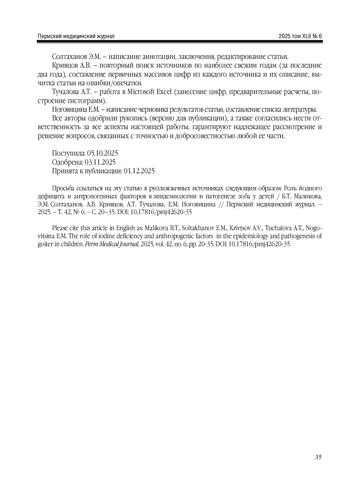 Maisigova D.I., Ekazheva F.M., Mambetkaliyeva N.N., Belonogova Yu.V. Problems of iodine deficiency in Russia on the example of the North Caucasus regions. Week of Russian science (WeRuS-2024): Collection of materials of the XIII All-Russian Week of Science. Saratov: SSMU 2024; 763-764 (in Russian).