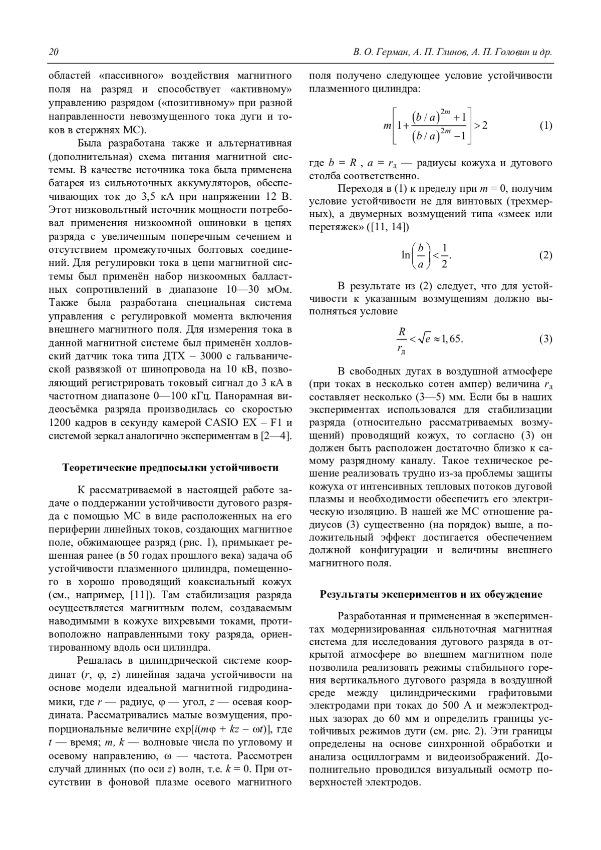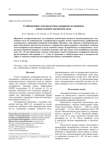 Герман В. О., Глинов А. П., Головин А. П., Козлов П. В., Шалеев К. В. Стабилизация электродуговых разрядов во внешнем азимутальном магнитном поле 18