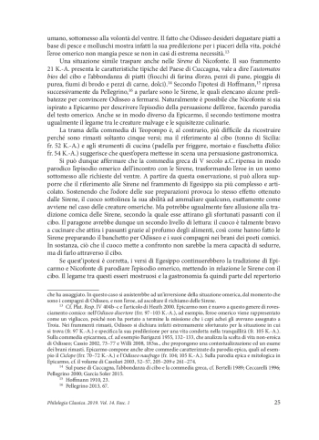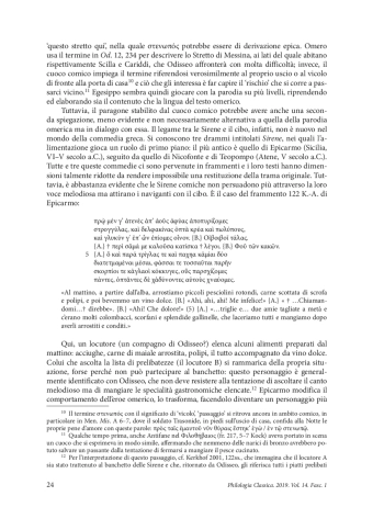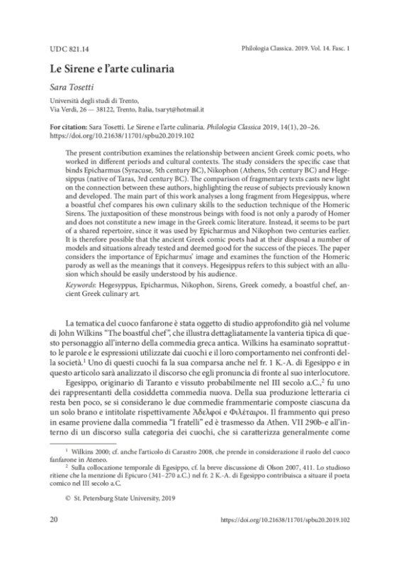 The present contribution examines the relationship between ancient Greek comic poets, who worked in different periods and cultural contexts. The study considers the specific case that binds Epicharmus (Syracuse, 5th century BC), Nikophon (Athens, 5th century BC) and Hegesippus (native of Taras, 3rd century BC). The comparison of fragmentary texts casts new light on the connection between these authors, highlighting the reuse of subjects previously known and developed. The main part of this work analyses a long fragment from Hegesippus, where a boastful chef compares his own culinary skills to the seduction technique of the Homeric Sirens. The juxtaposition of these monstrous beings with food is not only a parody of Homer and does not constitute a new image in the Greek comic literature. Instead, it seems to be part of a shared repertoire, since it was used by Epicharmus and Nikophon two centuries earlier. It is therefore possible that the ancient Greek comic poets had at their disposal a number of models and situations already tested and deemed good for the success of the pieces. The paper considers the importance of Epicharmus’ image and examines the function of the Homeric parody as well as the meanings that it conveys. Hegesippus refers to this subject with an allusion which should be easily understood by his audience