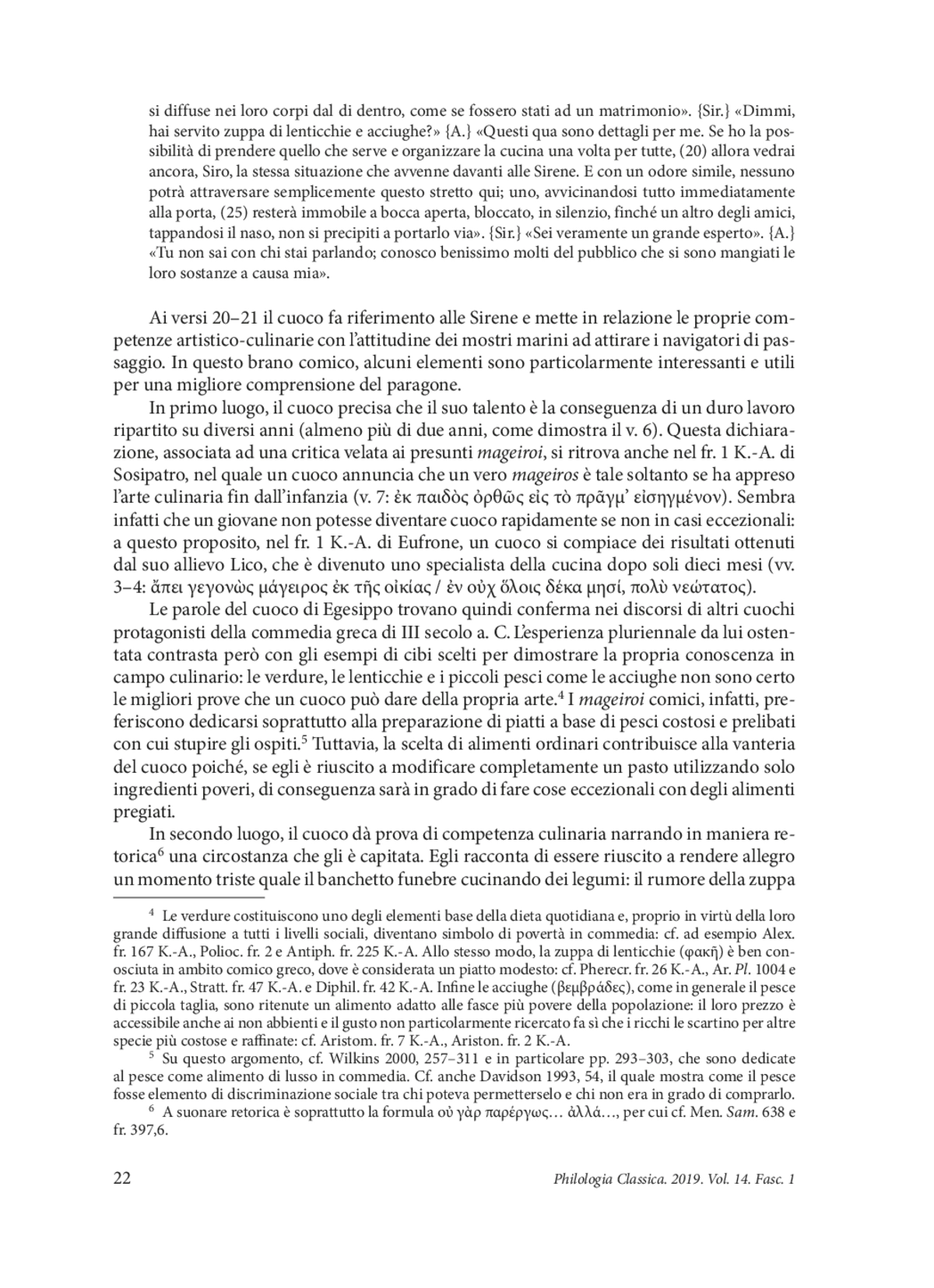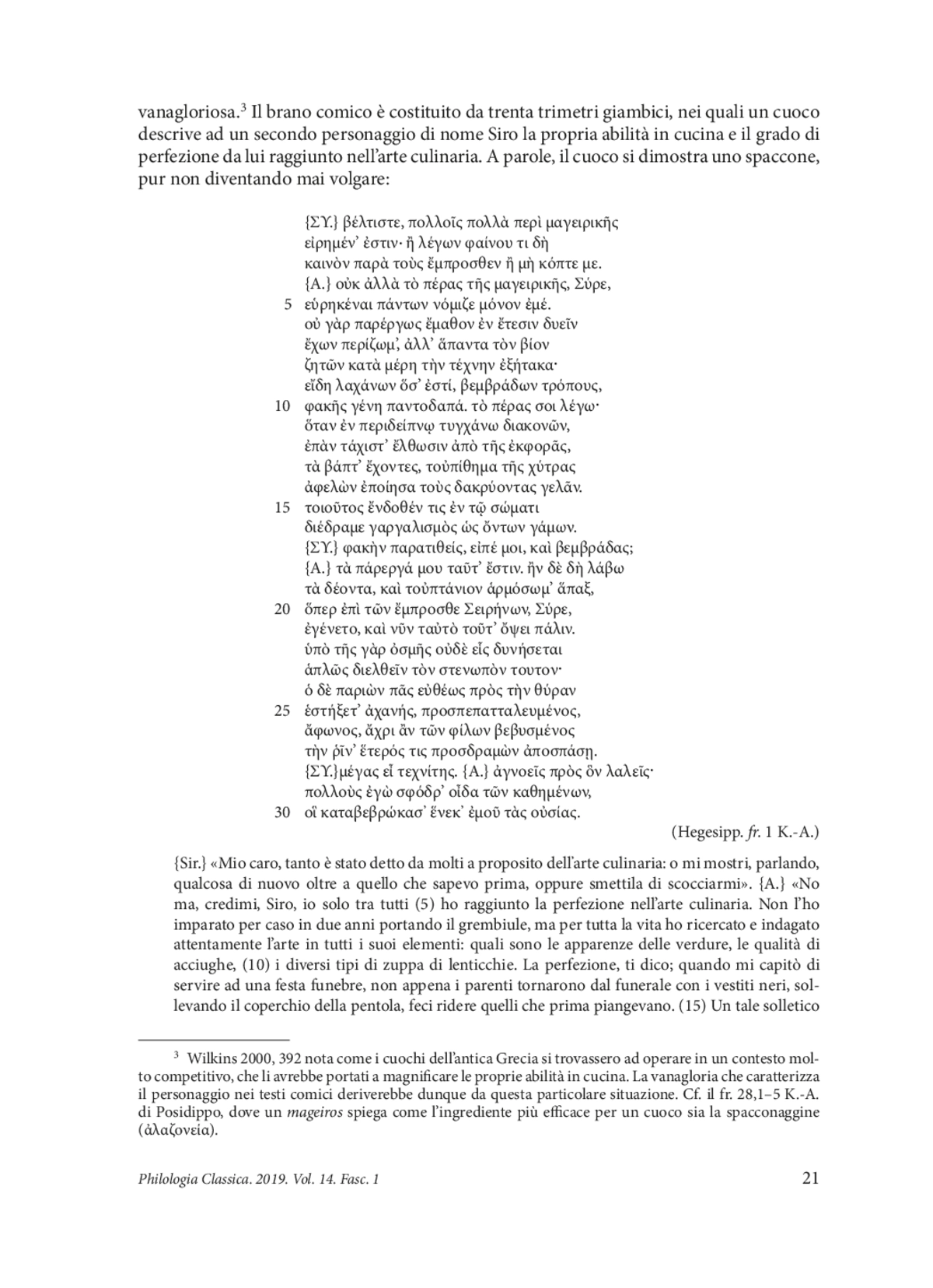 La tematica del cuoco fanfarone è stata oggetto di studio approfondito già nel volume di John Wilkins “The boastful chef ”, che illustra dettagliatamente la vanteria tipica di questo personaggio all’interno della commedia greca antica. Wilkins ha esaminato soprattutto le parole e le espressioni utilizzate dai cuochi e il loro comportamento nei confronti della società.1 Uno di questi cuochi fa la sua comparsa anche nel fr. 1 K.-A. di Egesippo e in questo articolo sarà analizzato il discorso che egli pronuncia di fronte al suo interlocutore