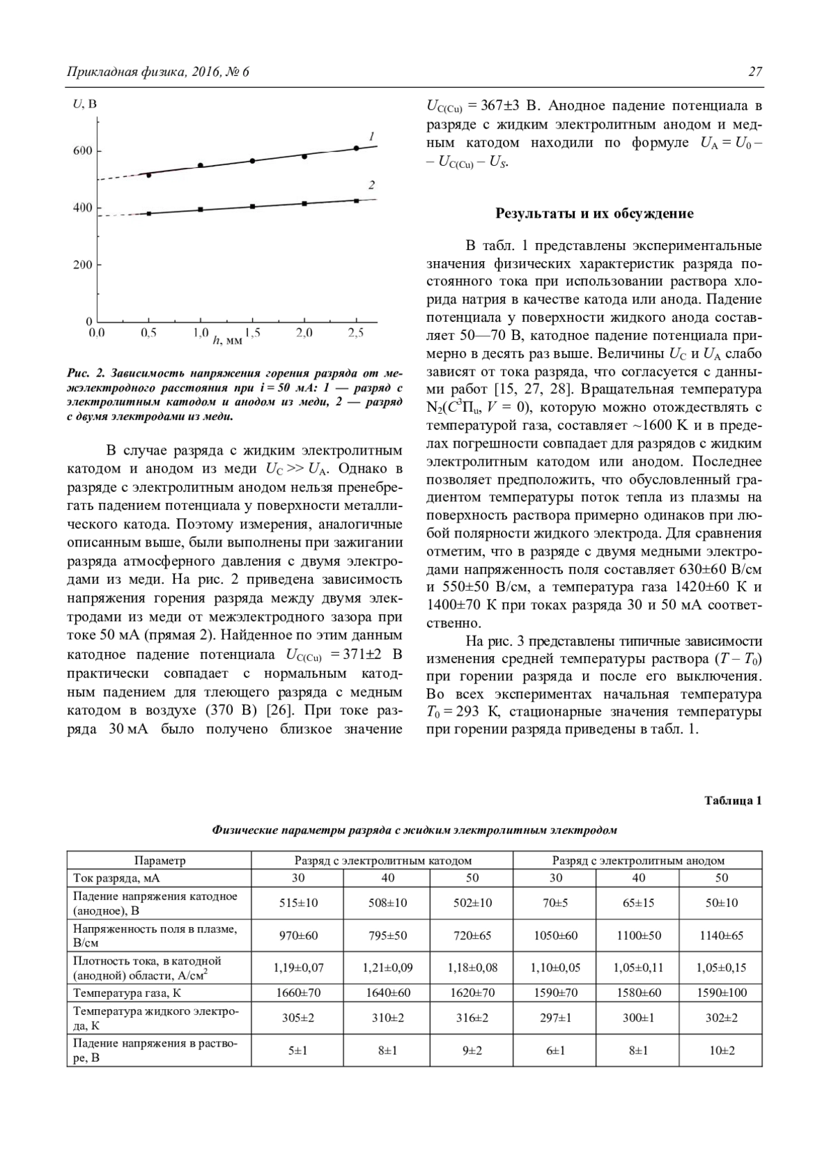 Исследован разряд постоянного тока (i = 10—50 мА) в воздухе при атмосферном давлении. В качестве катода или анода разряда использовали раствор хлорида натрия (0,5 моль/л). По зависимостям напряжение горения разряда от межэлектродного расстояния найдены напряженность поля в плазме и катодное (анодное) падение потенциала, температура газа определена по распределению интенсивности в полосе излучения N2(C3u B3 g, 0–2). Получены зависимости температуры жидкого электрода от времени горения разряда и после его выключения, а также скорость испарения раствора под действием разряда. На основе полученных данных обсуждаются вклады ионной бомбардировки и переноса тепла из плазмы в процессы нагрева жидкого электрода и переноса растворителя (воды) в газовую фазу.