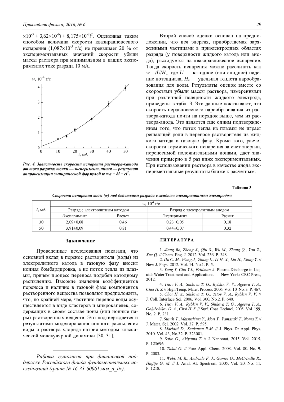 Проведенные исследования показали, что основной вклад в перенос растворителя (воды) из электролитного катода в газовую фазу вносит ионная бомбардировка, а не поток тепла из плазмы, причем процесс переноса подобен катодному распылению. Высокие значения коэффициентов переноса и наличие в газовой фазе компонентов растворенного вещества позволяют предположить, что, по крайней мере, частично перенос воды осуществляется в виде кластеров и микрокапелек, содержащих в своем составе ионы (или ионные пары) растворенных веществ. Это подтверждается и результатами моделирования ионного распыления воды и раствора хлорида натрия методом классической молекулярной динамики [30, 31].