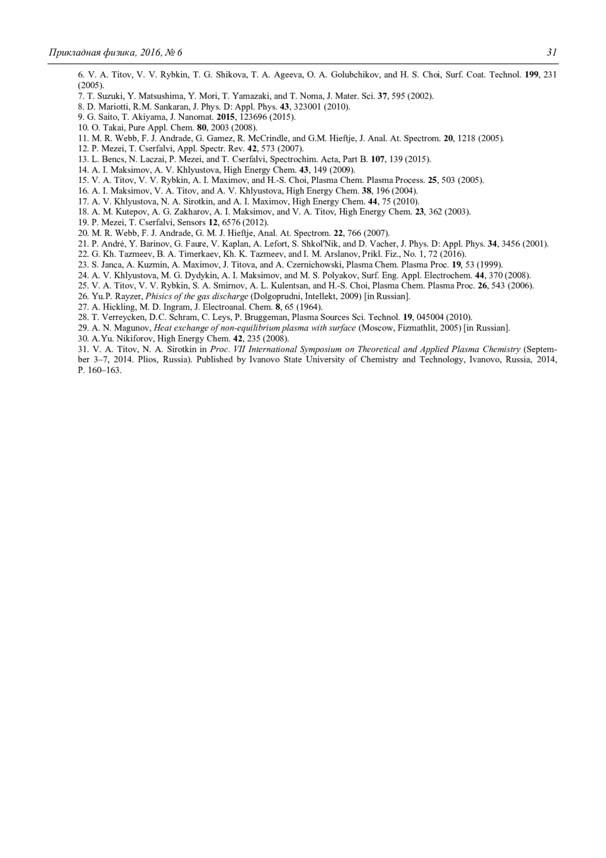 25. Titov V. A., Rybkin V. V., Smirnov S. A., Kulentsan A. L., Choi H.-S. // Plasma Chem. Plasma Proc. 2006. Vol. 26. No. 6. P. 543.