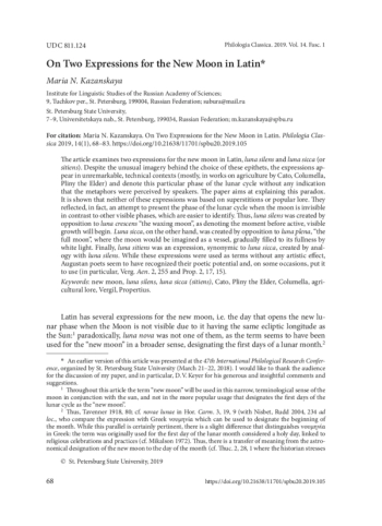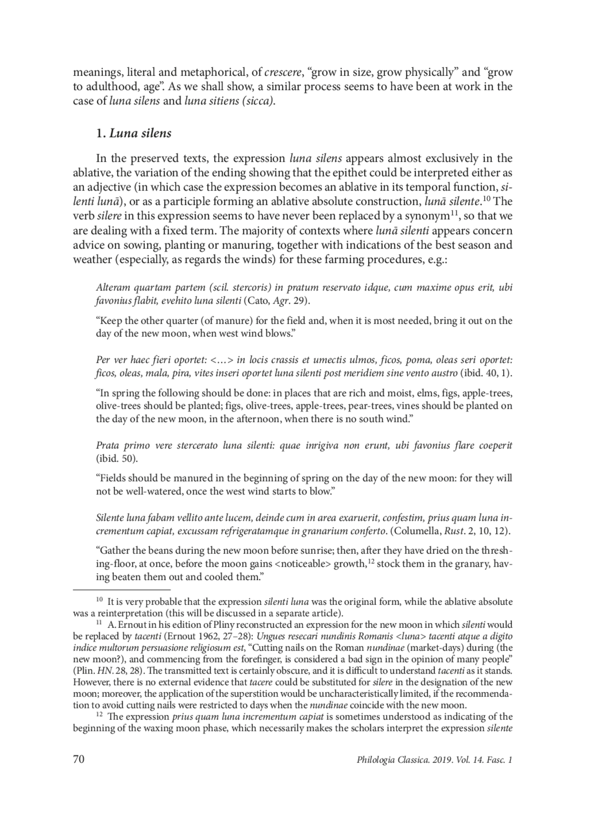 The article examines two expressions for the new moon in Latin, luna silens and luna sicca (or sitiens). Despite the unusual imagery behind the choice of these epithets, the expressions appear in unremarkable, technical contexts (mostly, in works on agriculture by Cato, Columella, Pliny the Elder) and denote this particular phase of the lunar cycle without any indication that the metaphors were perceived by speakers. The paper aims at explaining this paradox. It is shown that neither of these expressions was based on superstitions or popular lore. They reflected, in fact, an attempt to present the phase of the lunar cycle when the moon is invisible in contrast to other visible phases, which are easier to identify. Thus, luna silens was created by opposition to luna crescens “the waxing moon”, as denoting the moment before active, visible growth will begin. Luna sicca, on the other hand, was created by opposition to luna plena, “the full moon”, where the moon would be imagined as a vessel, gradually filled to its fullness by white light. Finally, luna sitiens was an expression, synonymic to luna sicca, created by analogy with luna silens. While these expressions were used as terms without any artistic effect, Augustan poets seem to have recognized their poetic potential and, on some occasions, put it to use (in particular, Verg. Aen. 2, 255 and Prop. 2, 17, 15).