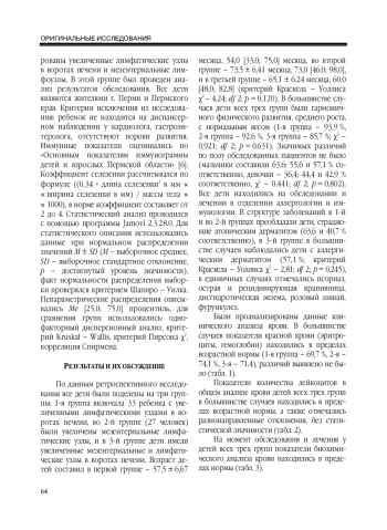 Цель. Проанализировать данные обследования детей, у которых при ультразвуковом исследовании органов брюшной полости выявлена гиперплазия лимфатических узлов. Материалы и методы. Проведен анализ результатов, полученных при обследовании детей в отделении ультразвуковой диагностики ДКБ № 13 г. Перми, и выявлено, что у 5,8 % детей на момент обследования регистрировались увеличенные лимфатические узлы брюшной полости. Все дети находились на стационарном лечении в отделении аллергологии и иммунологии. Обследование включало клинический анализ крови, общий биохимический анализ крови, иммунологическое обследование. Дети были поделены на три группы, в зависимости от расположения увеличенных лимфатических узлов в брюшной полости. Результаты. В результате исследования выявлена слабая отрицательная связь коэффициента Ритиса и уровня общего иммуноглобулина Е с низкой статистической значимостью. Выводы. Таким образом, у детей с острой аллергической патологией увеличение лимфатических узлов в брюшной полости не имеет решающего диагностического значения.