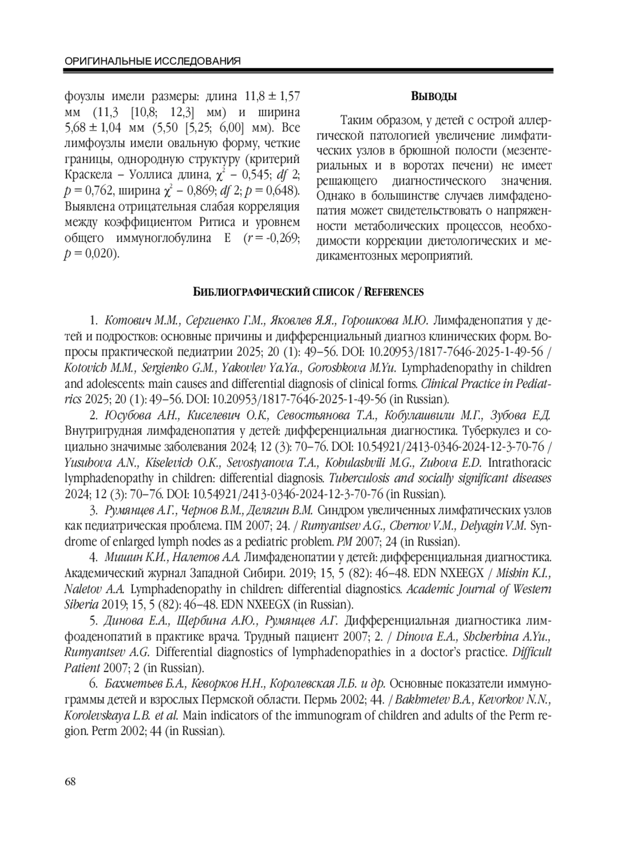 1. Котович М.М., Сергиенко Г.М., Яковлев Я.Я., Горошкова М.Ю. Лимфаденопатия у детей и подростков: основные причины и дифференциальный диагноз клинических форм. Вопросы практической педиатрии 2025; 20 (1): 49-56. DOI: 10.20953/1817-7646-2025-1-49-56