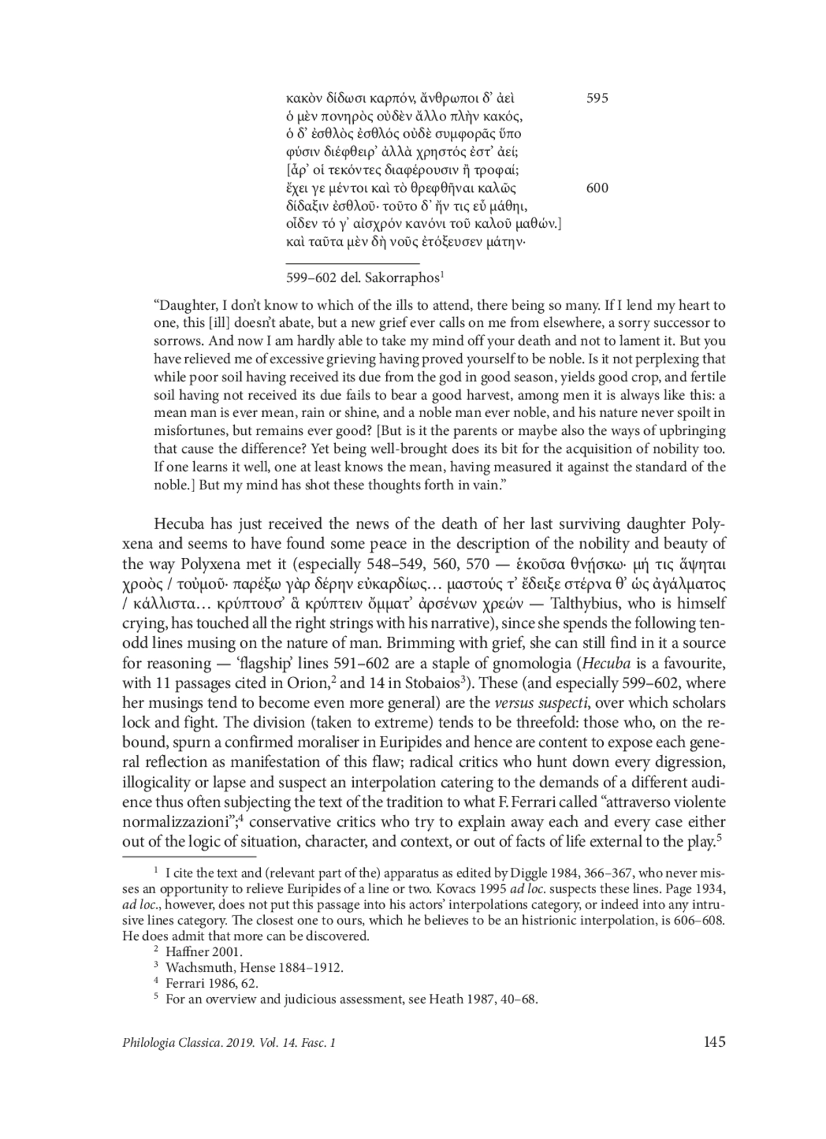 Hecuba has just received the news of the death of her last surviving daughter Polyxena and seems to have found some peace in the description of the nobility and beauty of the way Polyxena met it (especially 548–549, 560, 570 — ἑκοῦσα θνῄσκω· μή τις ἅψηται χροὸς / τοὐμοῦ· παρέξω γὰρ δέρην εὐκαρδίως… μαστούς τ’ ἔδειξε στέρνα θ’ ὡς ἀγάλματος / κάλλιστα… κρύπτουσ’ ἃ κρύπτειν ὄμματ’ ἀρσένων χρεών — Talthybius, who is himself crying, has touched all the right strings with his narrative), since she spends the following tenodd lines musing on the nature of man. Brimming with grief, she can still find in it a source for reasoning — ‘flagship’ lines 591–602 are a staple of gnomologia (Hecuba is a favourite, with 11 passages cited in Orion,2 and 14 in Stobaios3). These (and especially 599–602, where her musings tend to become even more general) are the versus suspecti, over which scholars lock and fight.