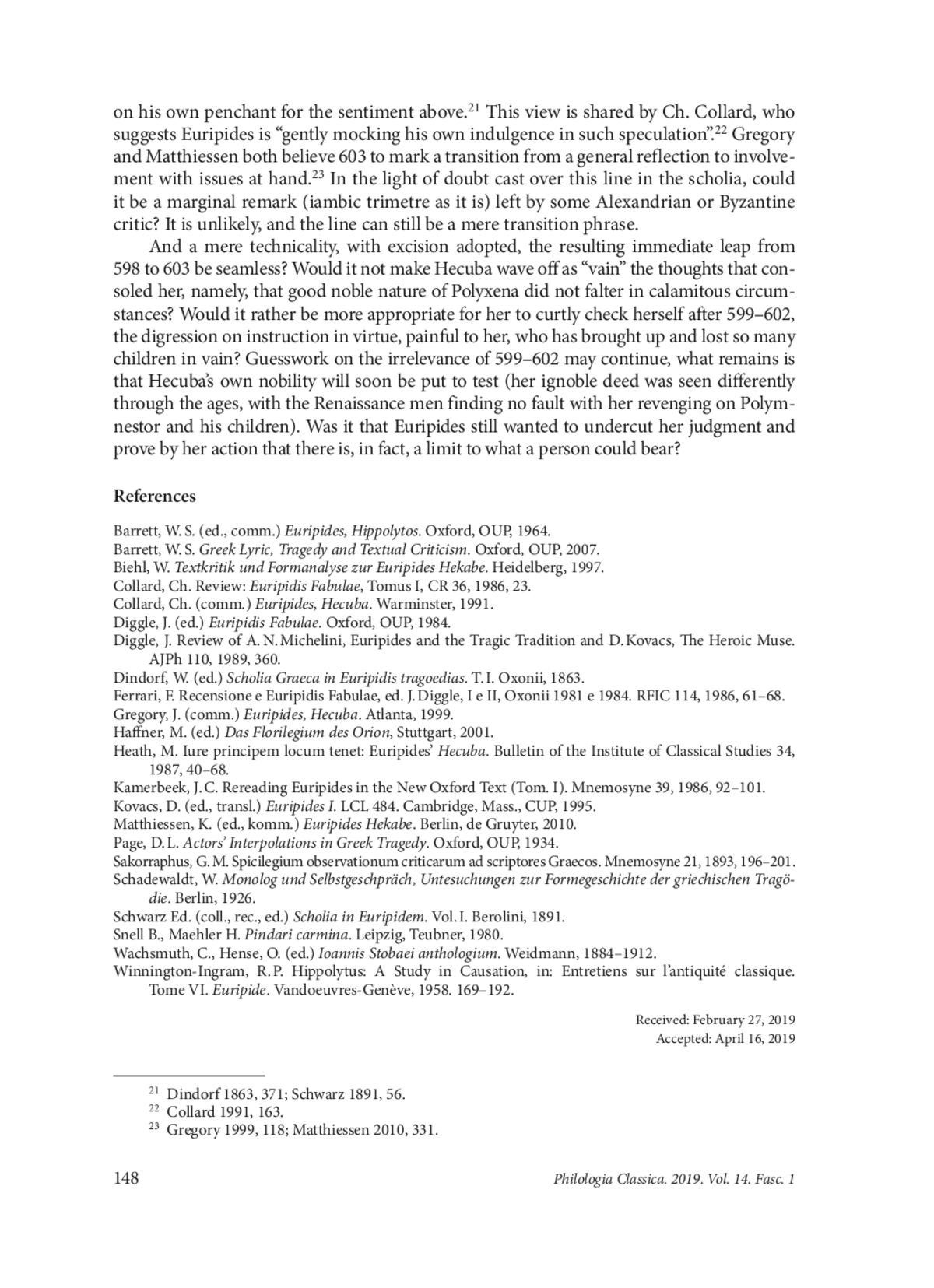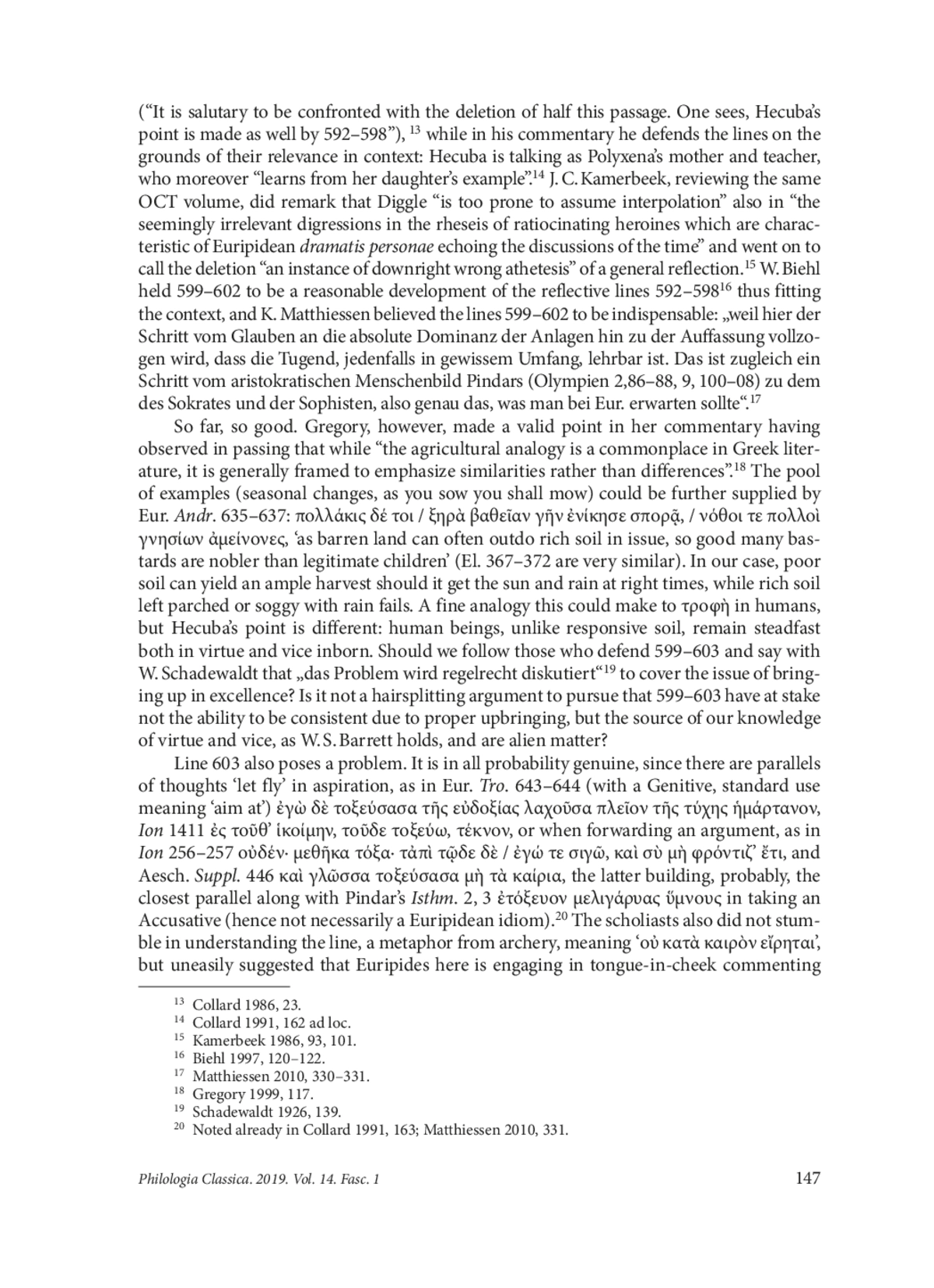 In this piece, attention is once again drawn to the locus classicus of Euripidean sententious outbursts, lines 599–602 put in the mouth of Hecuba mourning her daughter Polyxena. Suggested for bracketing by W. M. Sakorraphos in 1893 and athetised by J. Diggle (1984) and D. Kovacs (1995) in their respective editions (although not in the editions of J. Gregory (1999) and K. Matthiessen (2010), the lines (and the whole passage 592–602) have also shouldered a weight of Euripidean Weltanschauung doctrines built on their slender frame. A brief overview of scholarly judgment, often overexacting, prompts one to occupy the middling ground allowing both for the possibility of the genuine character of the lines 599–602 and their relevance in context (and not only expressing the ideas current in Euripides’ times) with both birth and upbringing contributing to virtuous character. The metaphor in line 603 should not be considered a brave mannerism, or a marginal remark of some critic, but a marker of a change of topic, its archery imagery well on the side of trite