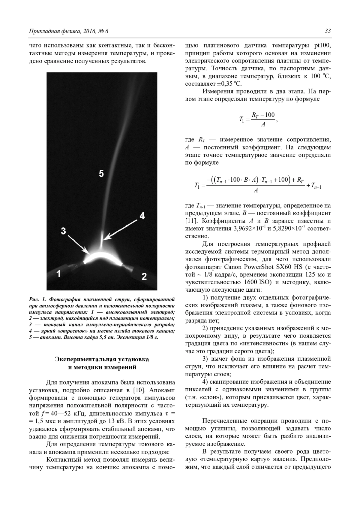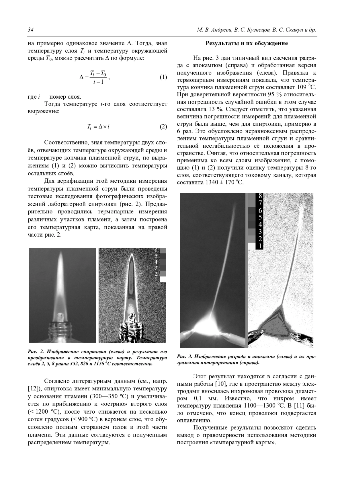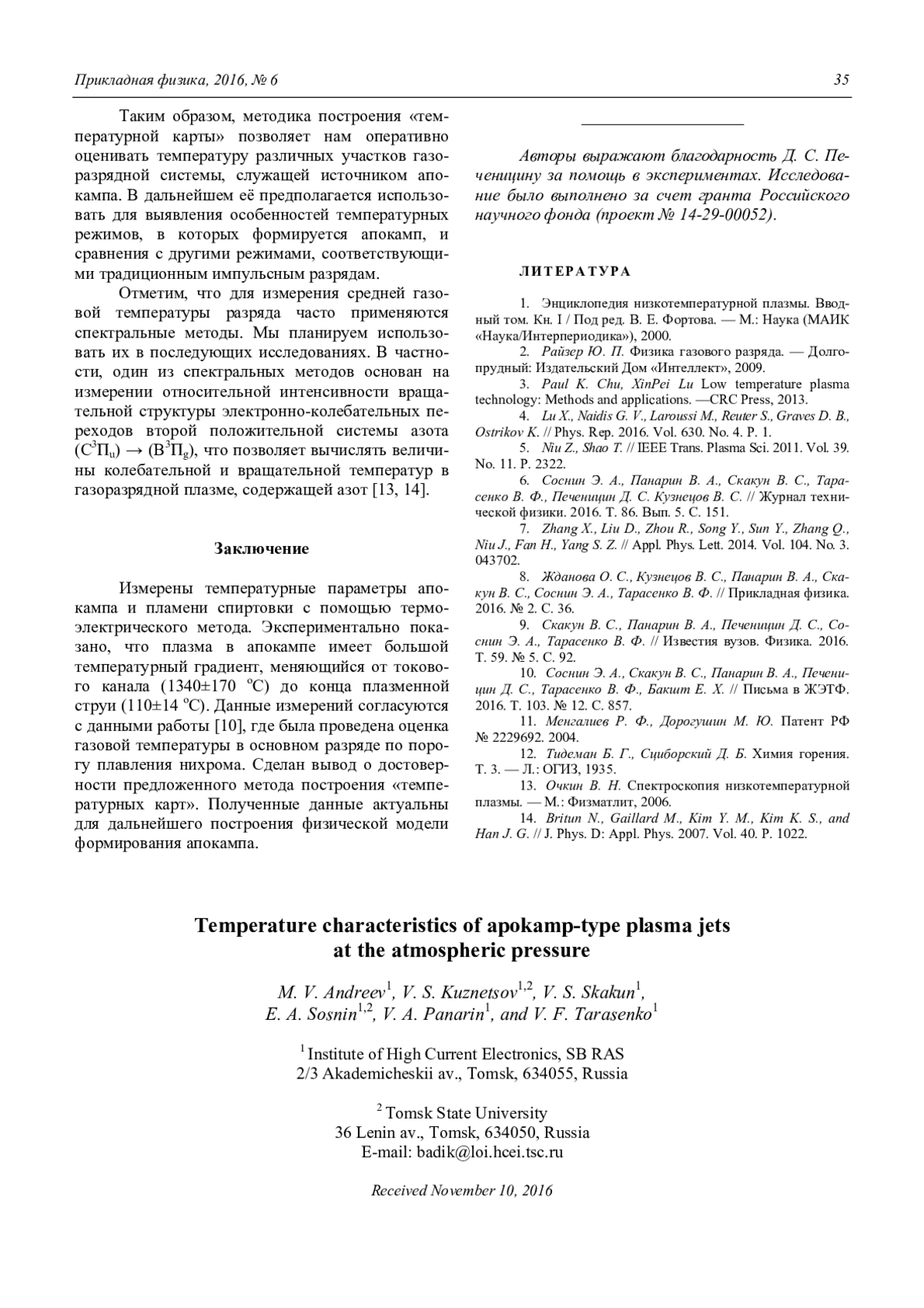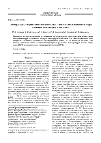Андреев М. В., Кузнецов В. С., Скакун В. С., Соснин Э. А., Панарин В. А., Тарасенко В. Ф. Температурные характеристики апокампа — нового типа плазменной струи в воздухе атмосферного давления 32