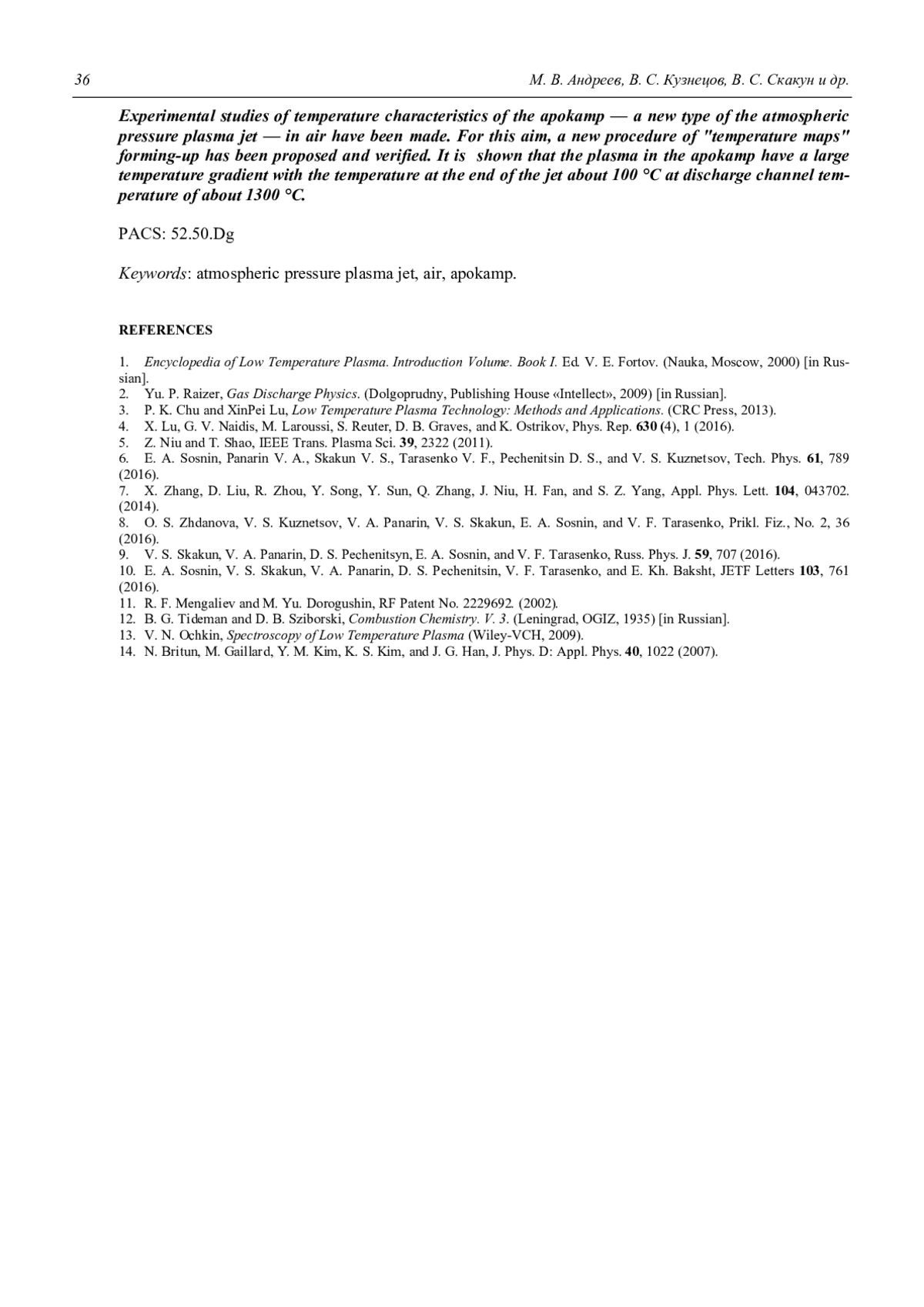M. V. Andreev, V. S. Kuznetsov, V. S. Skakun, E. A. Sosnin, V. А. Panarin, and V. F. Tarasenko Temperature characteristics of apo-kamp-type plasma jets at the atmospheric pressure 32