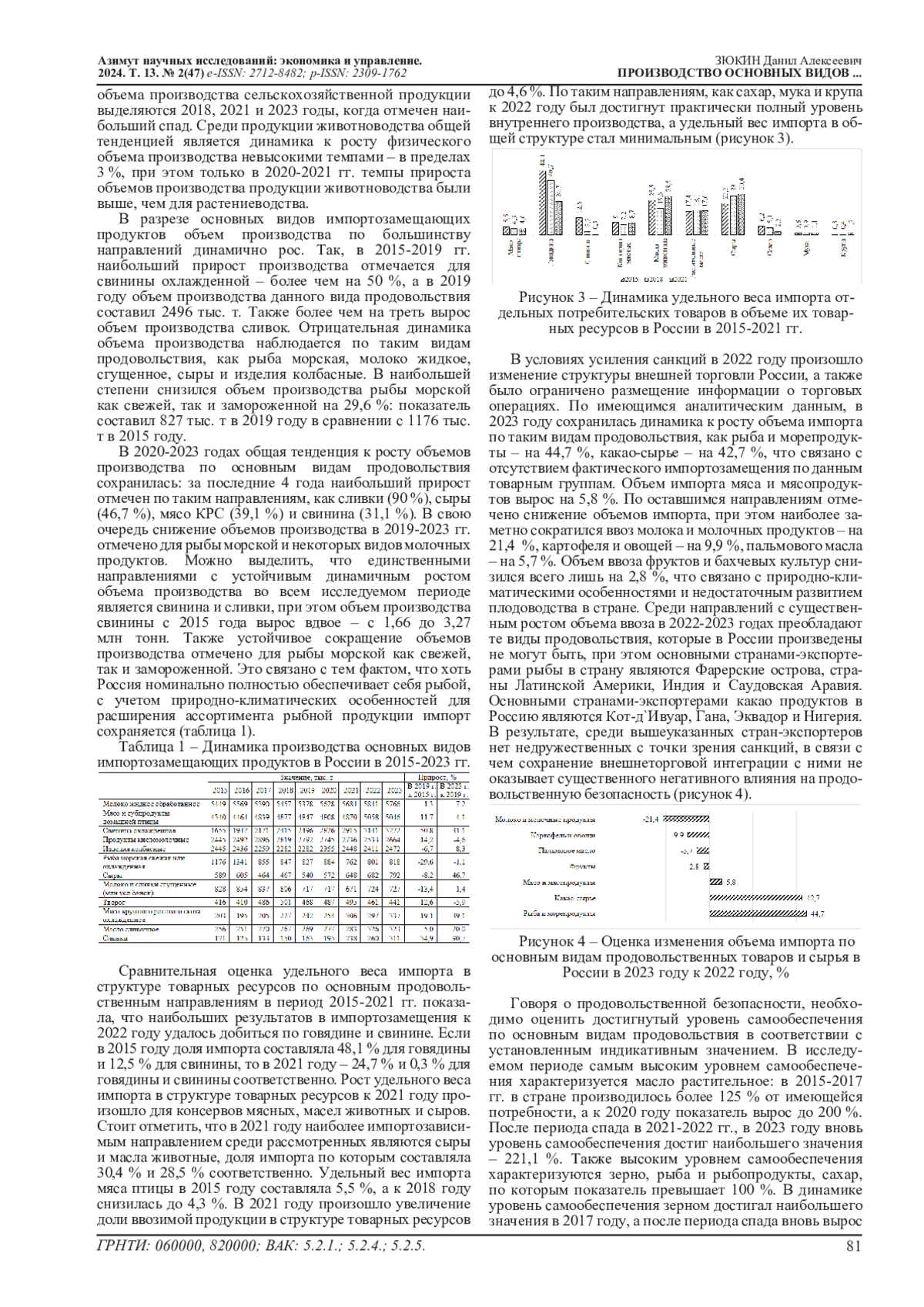 6. Соловьева Т.Н., Зюкин Д.А., Степерев Д.Ю. Импортозамещение как направление обеспечения продовольственной безопасности России // Вестник Курской государственной сельскохозяйственной академии. 2023. № 7. С. 195-201. EDN: JRNVGF