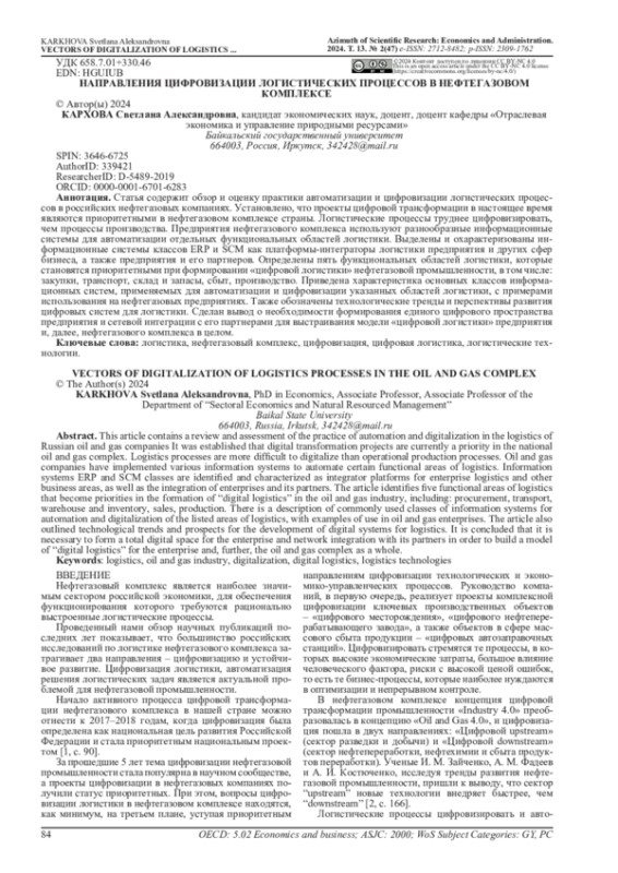 Статья содержит обзор и оценку практики автоматизации и цифровизации логистических процессов в российских нефтегазовых компаниях. Установлено, что проекты цифровой трансформации в настоящее время являются приоритетными в нефтегазовом комплексе страны. Логистические процессы труднее цифровизировать, чем процессы производства. Предприятия нефтегазового комплекса используют разнообразные информационные системы для автоматизации отдельных функциональных областей логистики. Выделены и охарактеризованы информационные системы классов ERP и SCM как платформы-интеграторы логистики предприятия и других сфер бизнеса, а также предприятия и его партнеров. Определены пять функциональных областей логистики, которые становятся приоритетными при формировании «цифровой логистики» нефтегазовой промышленности, в том числе: закупки, транспорт, склад и запасы, сбыт, производство. Приведена характеристика основных классов информационных систем, применяемых для автоматизации и цифровизации указанных областей логистики, с примерами использования на нефтегазовых предприятиях. Также обозначены технологические тренды и перспективы развития цифровых систем для логистики. Сделан вывод о необходимости формирования единого цифрового пространства предприятия и сетевой интеграции с его партнерами для выстраивания модели «цифровой логистики» предприятия и, далее, нефтегазового комплекса в целом.