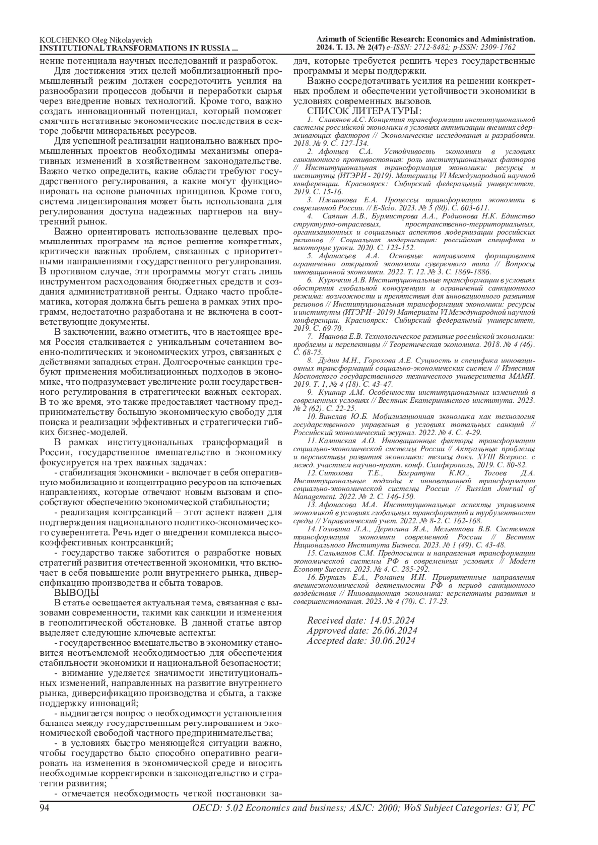 15. Сальманов С.М. Предпосылки и направления трансформации экономической системы РФ в современных условиях // Modern Economy Success. 2023. № 4. С. 285-292. EDN: XFFTRI