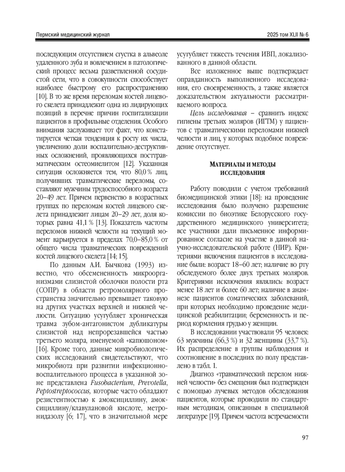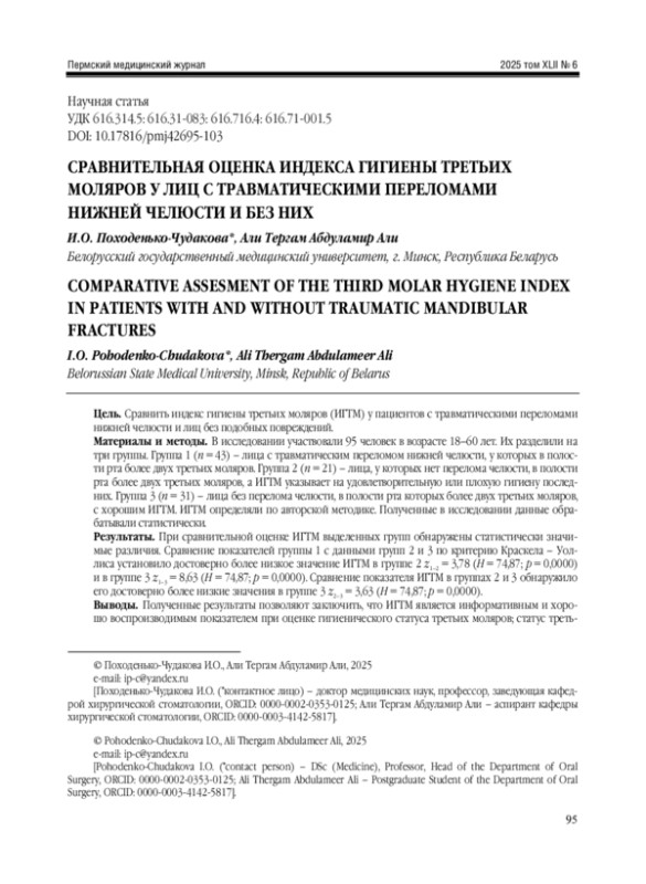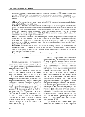 Материалы и методы. В исследовании участвовали 95 человек в возрасте 18-60 лет. Их разделили на три группы. Группа 1 ( n = 43) - лица с травматическим переломом нижней челюсти, у которых в полости рта более двух третьих моляров. Группа 2 ( n = 21) - лица, у которых нет перелома челюсти, в полости рта более двух третьих моляров, а ИГТМ указывает на удовлетворительную или плохую гигиену последних. Группа 3 ( n = 31) - лица без перелома челюсти, в полости рта которых более двух третьих моляров, с хорошим ИГТМ. ИГТМ определяли по авторской методике. Полученные в исследовании данные обрабатывали статистически.