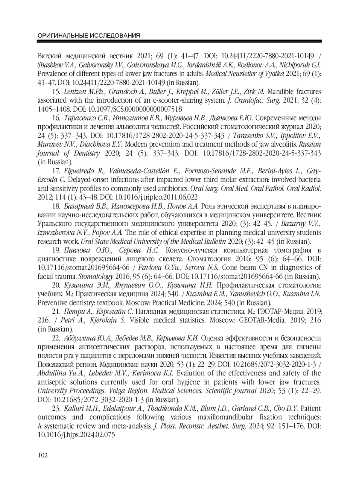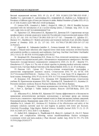 13. Габадуллина Г.С., Ксембаев С.С., Гильманов А.А., Иванов О.А. Медико-статистическая характеристика пациентов с переломами костей лицевого скелета. Российская стоматология 2022; 15 (4): 7-10. DOI: 10.17116/rosstomat2022150417