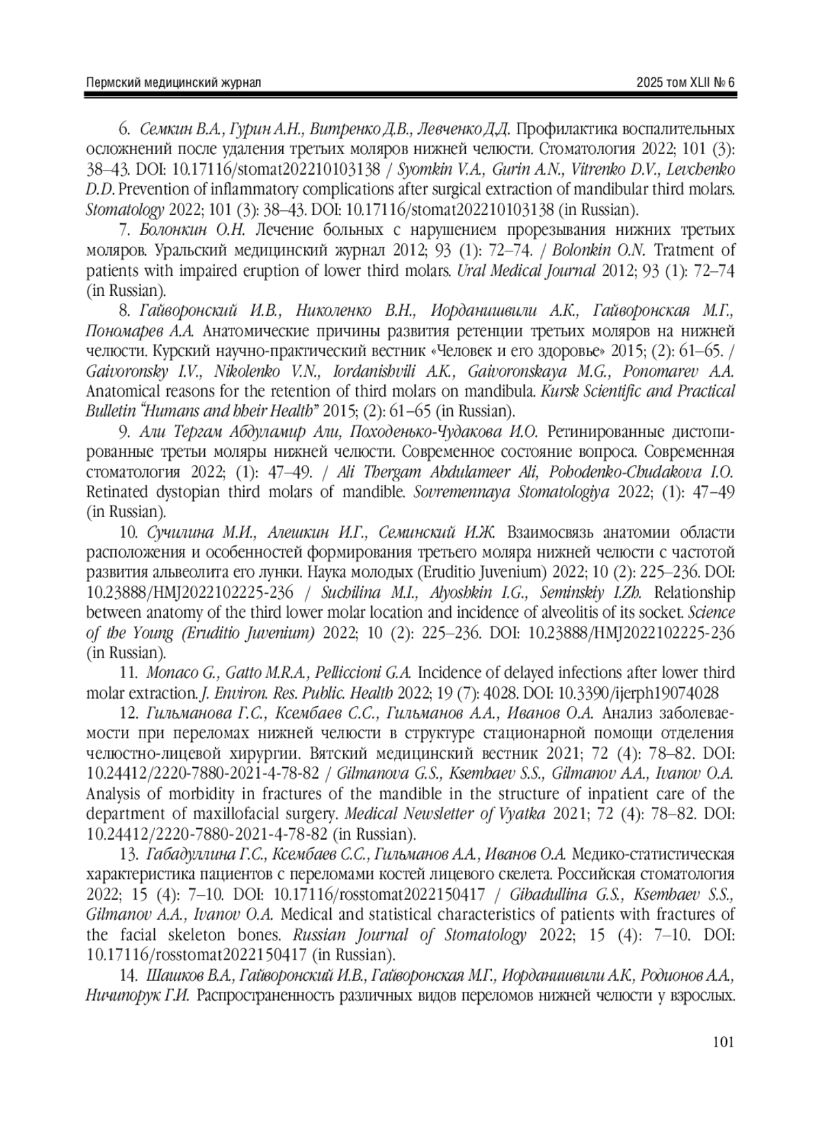 6. Семкин В.А., Гурин А.Н., Витренко Д.В., Левченко Д.Д. Профилактика воспалительных осложнений после удаления третьих моляров нижней челюсти. Стоматология 2022; 101 (3): 38-43. DOI: 10.17116/stomat202210103138