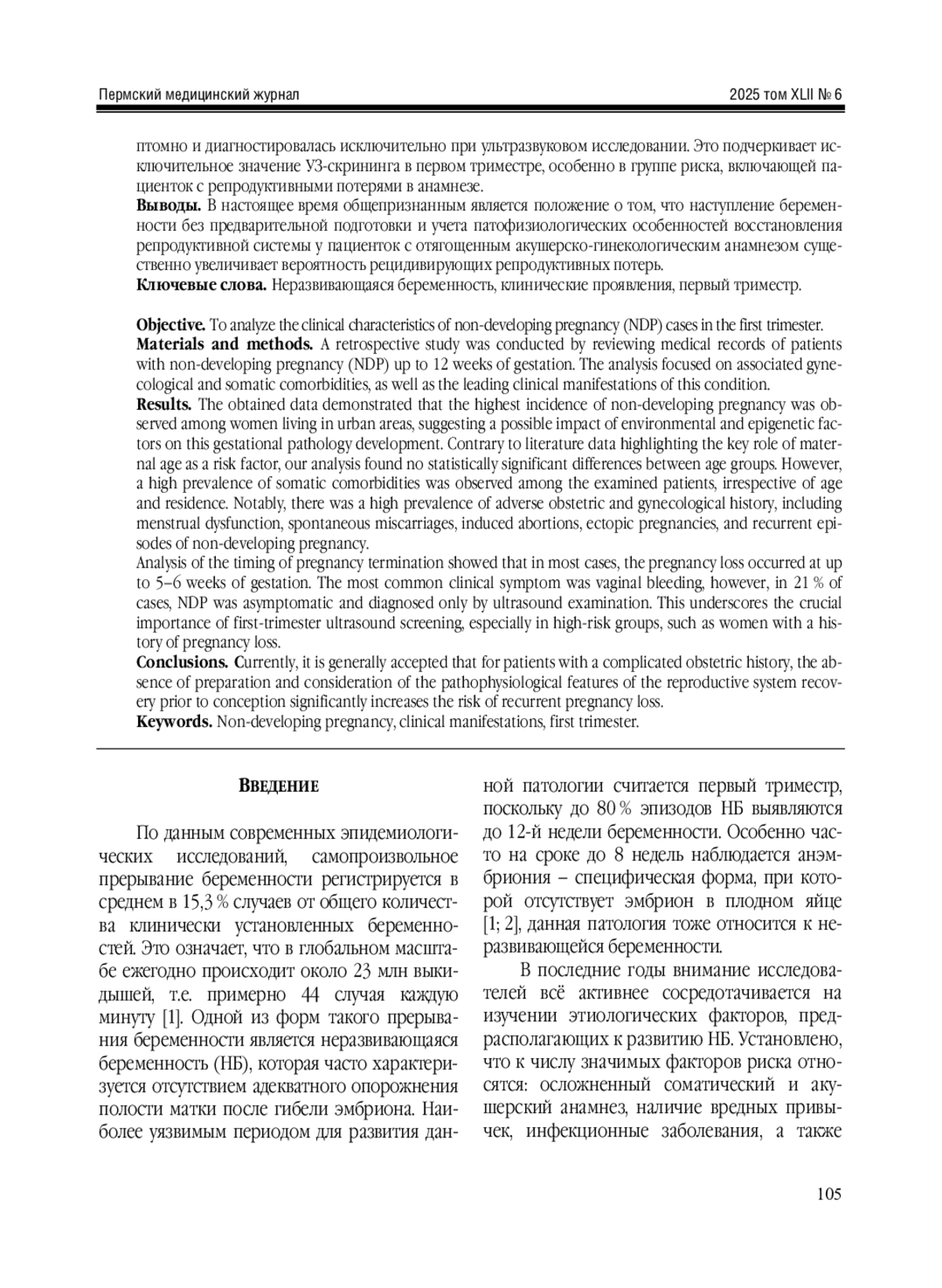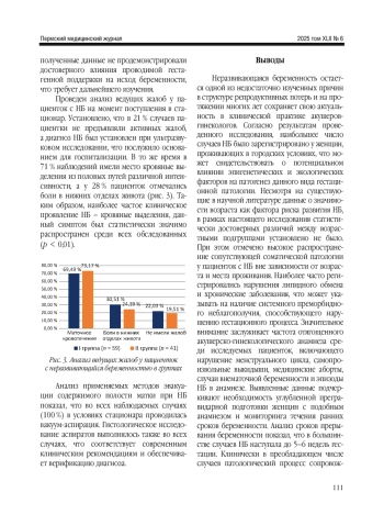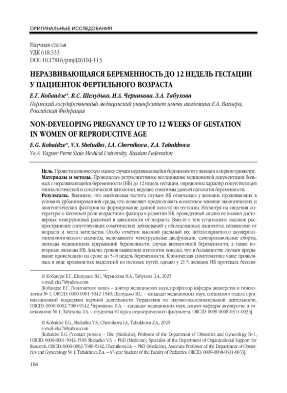Результаты. Выявлено, что наибольшая частота случаев НБ отмечалась у женщин, проживающих в условиях урбанизированной среды, что позволяет предположить возможное влияние экологических и эпигенетических факторов на формирование данной патологии гестации. Несмотря на сведения литературы о ключевой роли возрастного фактора в развитии НБ, проведенный анализ не выявил достоверных межгрупповых различий в зависимости от возраста. Вместе с тем установлено высокое распространение сопутствующих соматических заболеваний у обследованных пациенток, независимо от возраста и места жительства. Особо отметим высокий удельный вес неблагоприятного акушерско-гинекологического анамнеза, включавшего менструальные дисфункции, самопроизвольные аборты, эпизоды медицинских прерываний беременности, случаи внематочной беременности, а также повторные эпизоды НБ. Анализ сроков выявления патологии показал, что в большинстве случаев прерывание происходило на сроке до 5-6 недель беременности. Клиническая симптоматика чаще проявлялась в виде кровянистых выделений из половых путей, однако у 21 % женщин НБ протекала бессимптомно и диагностировалась исключительно при ультразвуковом исследовании. Это подчеркивает исключительное значение УЗ-скрининга в первом триместре, особенно в группе риска, включающей пациенток с репродуктивными потерями в анамнезе.