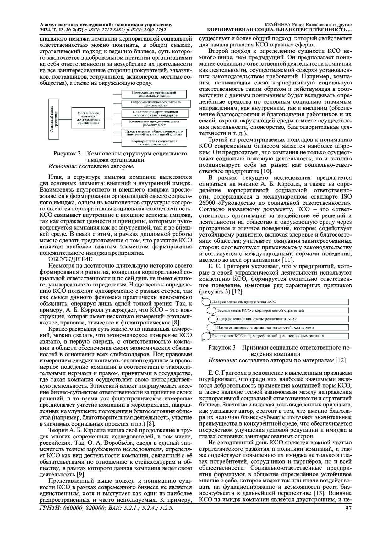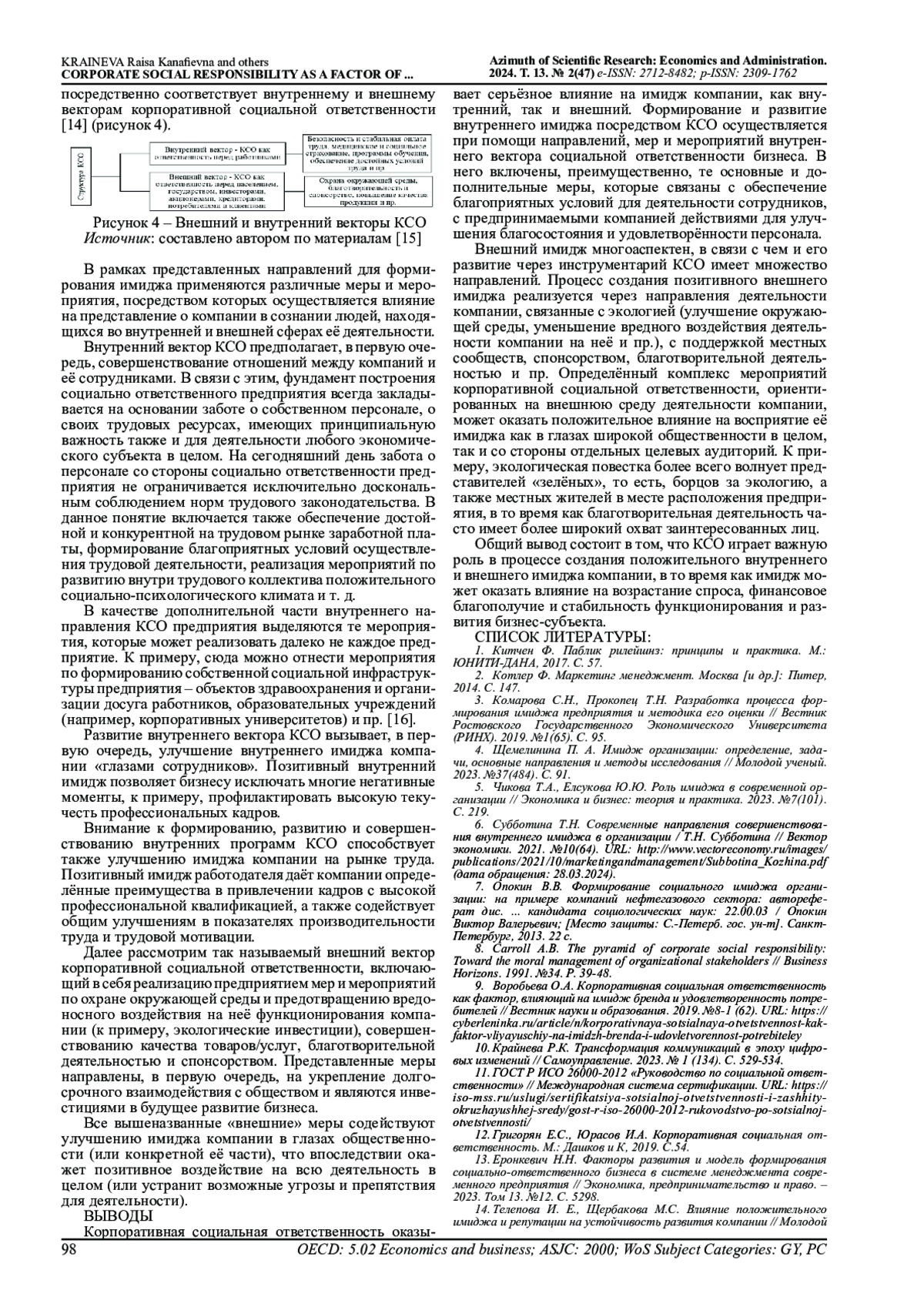 Cтатья рассматривает значение и роль корпоративной социальной ответственности (КСО) в формировании внутреннего и внешнего имиджа компании. Различаются два основных вектора действий в рамках КСО: внутренний, направленный на улучшение условий для сотрудников, и внешний, ориентированный на отношения с окружающей средой и обществом. Успешное развитие КСО способствует увеличению доходности и укреплению стабильности компании, повышению деловой репутации. В статье подчёркивается важность соответствия действий компании между внутренними и внешними векторами КСО для формирования позитивного имиджа и устойчивого развития. В числе основных характеристик деятельности современных компаний наряду с маркетинговой стратегией, деловой репутацией и корпоративной культурой, выделяется такой важный элемент, как имидж. Данный элемент, с одной стороны, обусловливает особенности восприятия того или иного бизнес-субъекта обществом, а с другой стороны выступает в качестве значимого инструмента повышения конкурентоспособности и улучшения положения компании на рынке.