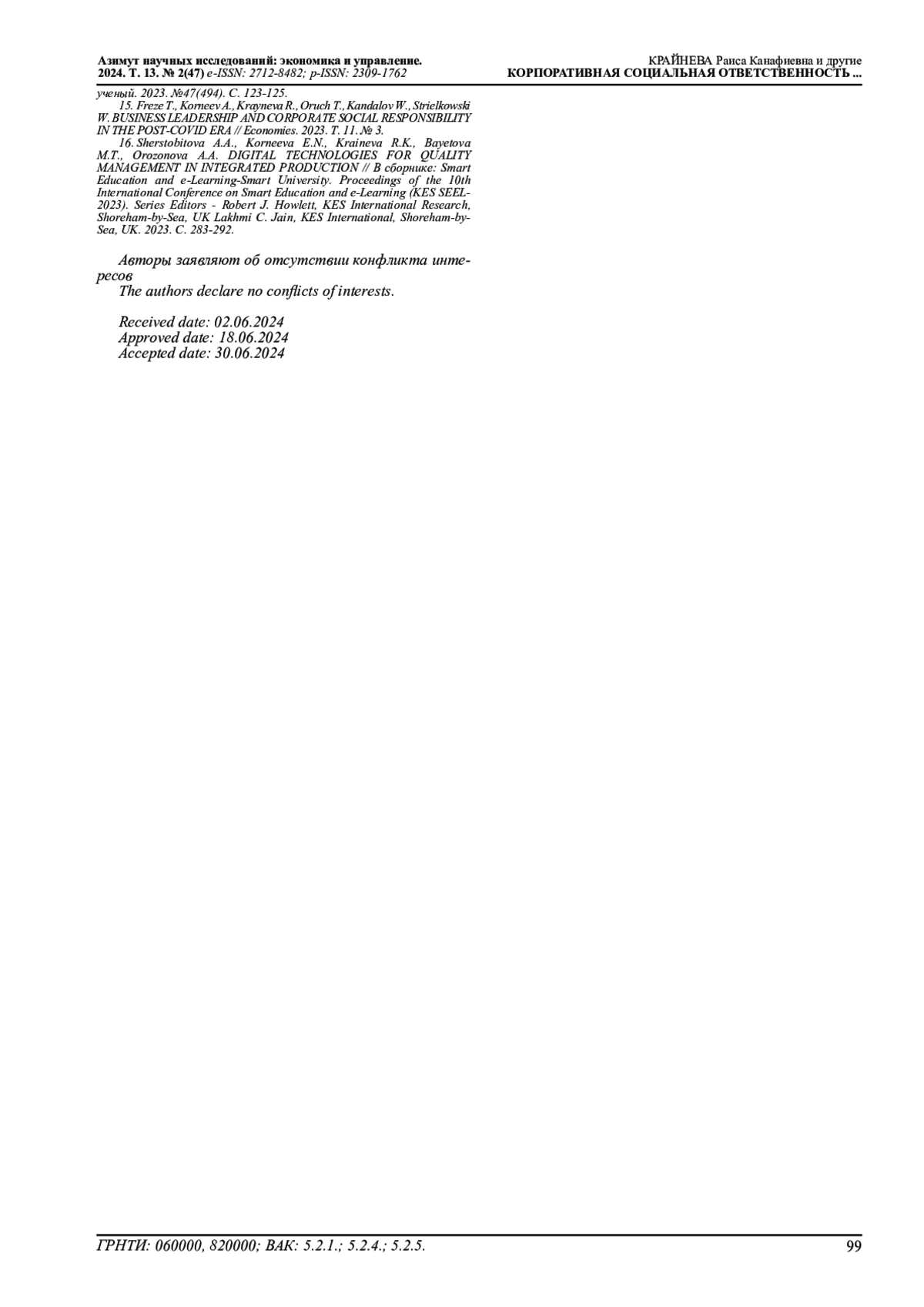 15. Freze T., Korneev A., Krayneva R., Oruch T., Kandalov W., Strielkowski W. BUSINESS LEADERSHIP AND CORPORATE SOCIAL RESPONSIBILITY IN THE POST-COVID ERA // Economies. 2023. Т. 11. № 3. EDN: NGXEQL