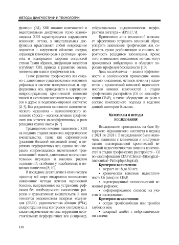 Результаты. Выявлено, что в основной группе полное заживление язв достигнуто у 90 % пациентов в течение 12 недель, тогда как в контрольной - у 55 % ( p < 0,01). Частота рецидивов в течение года была существенно ниже при использовании малоинвазивной хирургии. Обосновано, что минимально инвазивные методы лечения обладают высокой клинической эффективностью, способствуют быстрому заживлению язв и снижению частоты рецидивов, а также могут рассматриваться как предпочтительный метод терапии при стадии ХВН C6.