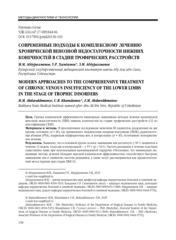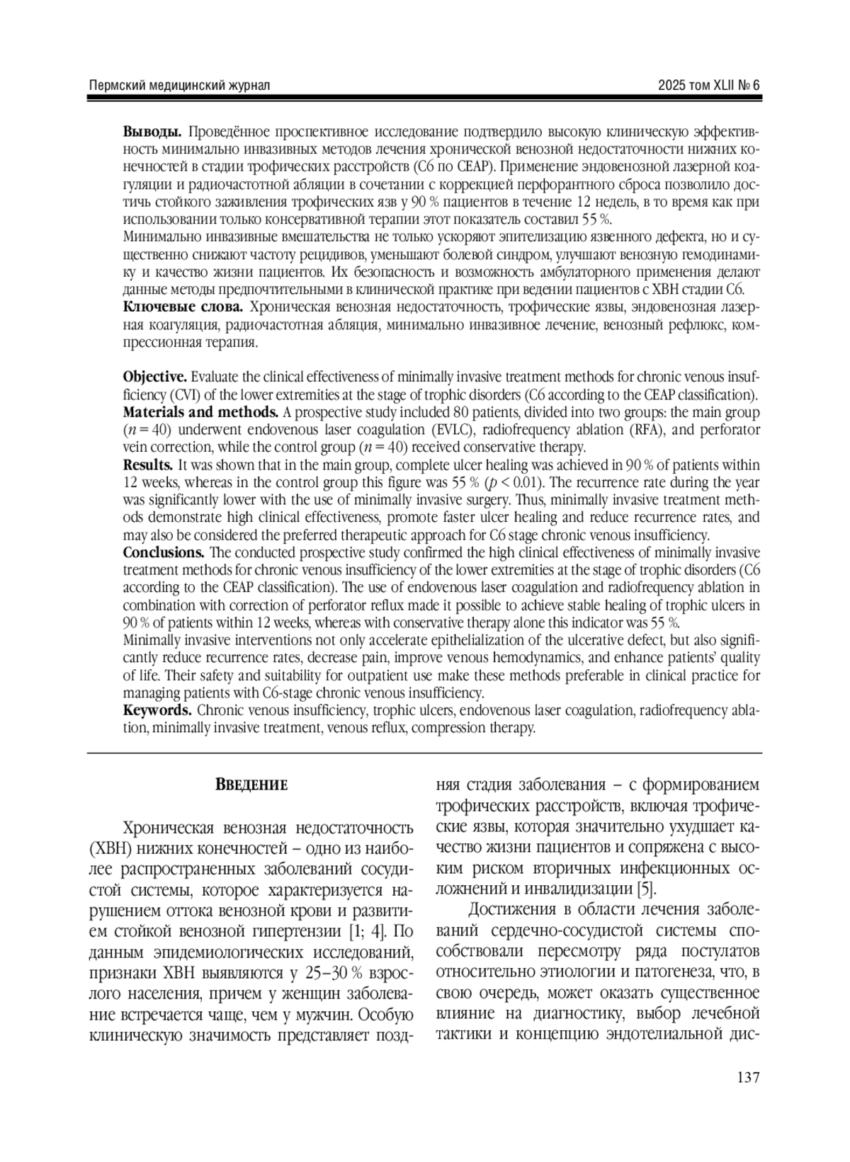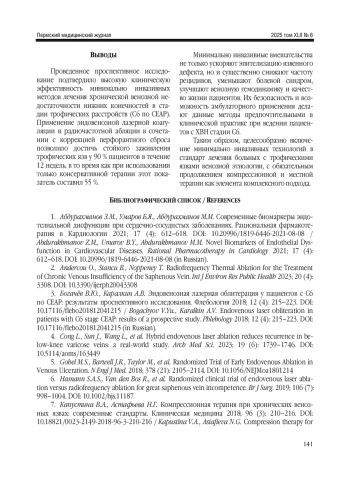 Выводы. Проведённое проспективное исследование подтвердило высокую клиническую эффективность минимально инвазивных методов лечения хронической венозной недостаточности нижних конечностей в стадии трофических расстройств (C6 по CEAP). Применение эндовенозной лазерной коагуляции и радиочастотной абляции в сочетании с коррекцией перфорантного сброса позволило достичь стойкого заживления трофических язв у 90 % пациентов в течение 12 недель, в то время как при использовании только консервативной терапии этот показатель составил 55 %. Минимально инвазивные вмешательства не только ускоряют эпителизацию язвенного дефекта, но и существенно снижают частоту рецидивов, уменьшают болевой синдром, улучшают венозную гемодинамику и качество жизни пациентов. Их безопасность и возможность амбулаторного применения делают данные методы предпочтительными в клинической практике при ведении пациентов с ХВН стадии С6.