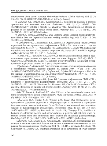 9. Reitz K.M., Salem K., Mohapatra A., et al.Complete Venous Ulceration Healing after Perforator Ablation Does Not Depend on Treatment Modality. Ann Vasc Surg. 2021; 70: 109-115. DOI: 10.1016/j.avsg.2020.06.051