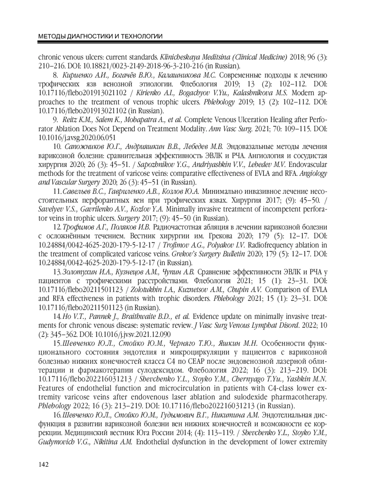 13. Золотухин И.А., Кузнецов А.М., Чупин А.В. Сравнение эффективности ЭВЛК и РЧА у пациентов с трофическими расстройствами. Флебология 2021; 15 (1): 23-31. DOI: 10.17116/flebo20211501123