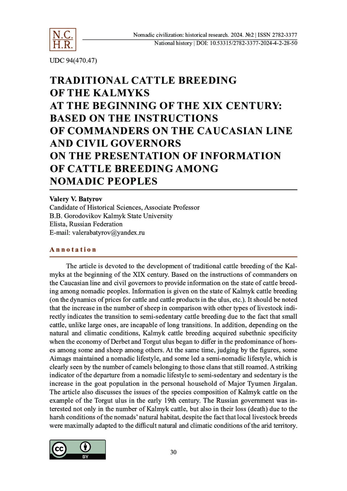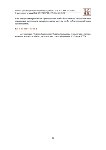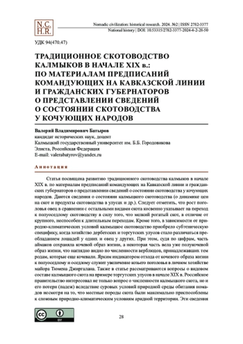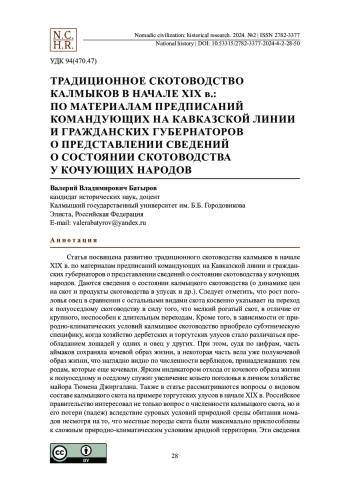 Статья посвящена развитию традиционного скотоводства калмыков в начале XIX в. по материалам предписаний командующих на Кавказской линии и гражданских губернаторов о представлении сведений о состоянии скотоводства у кочующих народов. Даются сведения о состоянии калмыцкого скотоводства (о динамике цен на скот и продукты скотоводства в улусах и др.). Следует отметить, что рост поголовья овец в сравнении с остальными видами скота косвенно указывает на переход к полуоседлому скотоводству в силу того, что мелкий рогатый скот, в отличие от крупного, неспособен к длительным переходам. Кроме того, в зависимости от природно-климатических условий калмыцкое скотоводство приобрело субэтническую специфику, когда хозяйство дербетских и торгутских улусов стало различаться преобладанием лошадей у одних и овец у других. При этом, судя по цифрам, часть аймаков сохраняла кочевой образ жизни, а некоторая часть вела уже полукочевой образ жизни, что наглядно видно по численности верблюдов, принадлежавших тем родам, которые еще кочевали. Ярким индикатором отхода от кочевого образа жизни к полуоседлому и оседлому служит увеличение козьего поголовья в личном хозяйстве майора Тюмена Джиргалана. Также в статье рассматриваются вопросы о видовом составе калмыцкого скота на примере торгутских улусов в начале XIX в. Российское правительство интересовал не только вопрос о численности калмыцкого скота, но и его потери (падеж) вследствие суровых условий природной среды обитания номадов несмотря на то, что местные породы скота были максимально приспособлены к сложным природно-климатическим условиям аридной территории. Эти сведения тоже интересовали российское правительство, чтобы было понятно, насколько может сократиться численность калмыцкого скота в случае особо неблагоприятной зимы или эпизоотии.