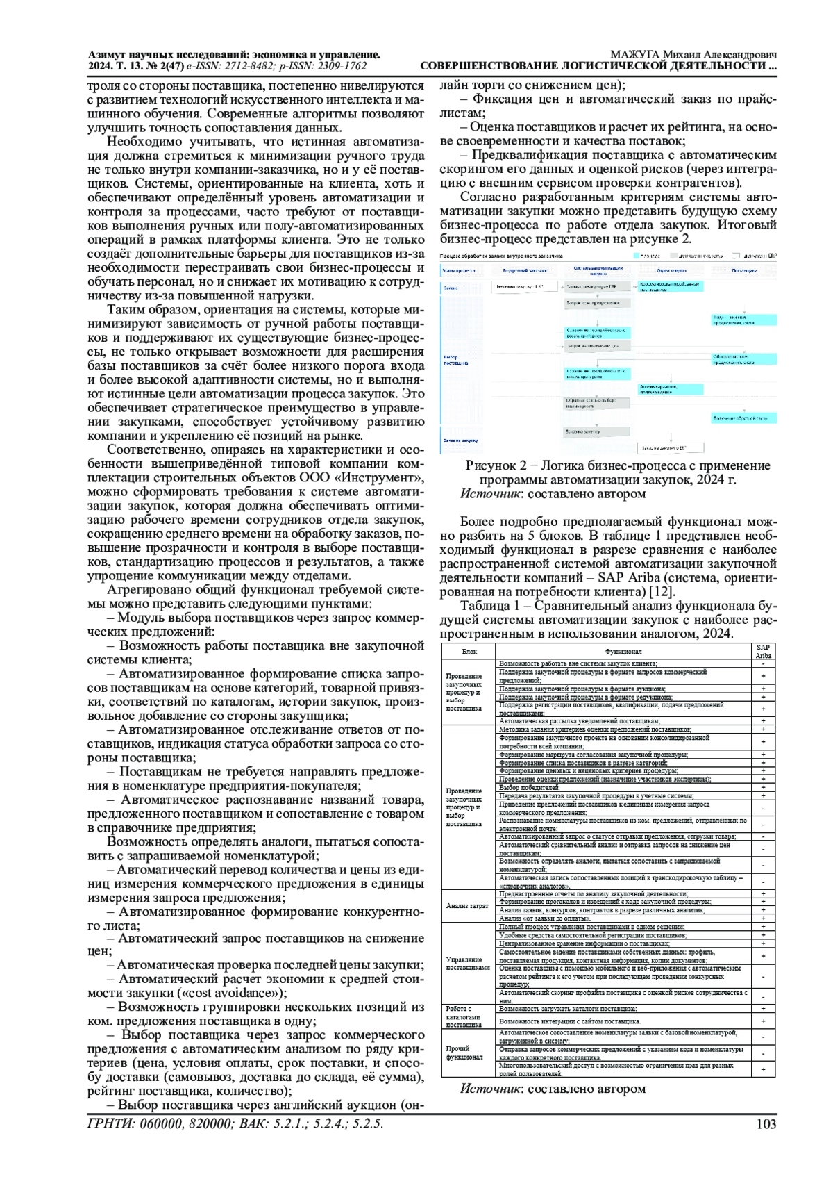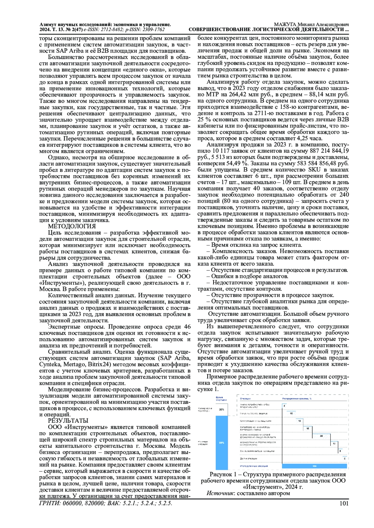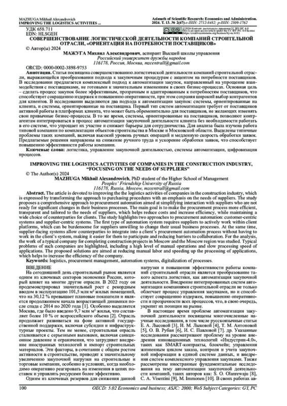 Основная цель - сделать процесс закупок более эффективным, прозрачным и адаптированным к потребностям поставщиков, что способствует сокращению издержек и повышению оперативности, при этом сохраняя широкий выбор контрагентов для клиентов. В исследовании выделяются два подхода к автоматизации закупок: системы, ориентированные на клиента, и системы, ориентированные на поставщика. Первый тип систем автоматизации требует от поставщиков активной работы в платформах клиента, что может быть обременительно для поставщиков, не желающих изменять свои привычные бизнес-процессы. В то же время, системы, ориентированные на поставщиков, позволяют контрагентам интегрироваться в процесс автоматизации закупочной деятельности клиента без необходимости работать в его системе, что упрощает их участие и снижает барьеры для сотрудничества. Для анализа была изучена работа типовой компании по комплектации объектов строительства в Москве и Московской области. Выделены типичные проблемы таких компаний, включая высокий уровень ручных операций и медленную скорость обработки заявок. Предлагаемые решения направлены на снижение ручного труда и ускорение обработки заявок, что способствует повышению эффективности работы компании.