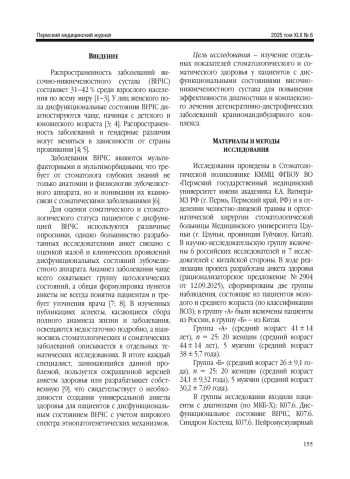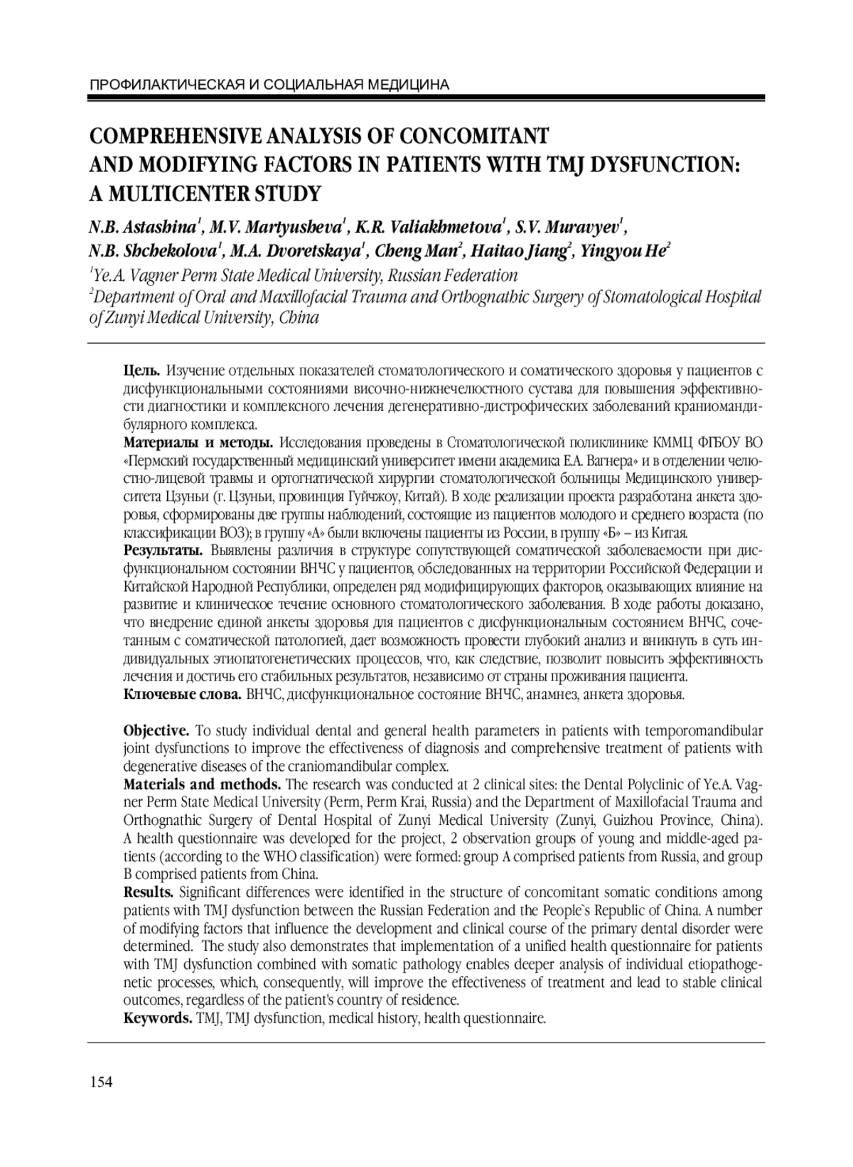 Результаты. Выявлены различия в структуре сопутствующей соматической заболеваемости при дисфункциональном состоянии ВНЧС у пациентов, обследованных на территории Российской Федерации и Китайской Народной Республики, определен ряд модифицирующих факторов, оказывающих влияние на развитие и клиническое течение основного стоматологического заболевания. В ходе работы доказано, что внедрение единой анкеты здоровья для пациентов с дисфункциональным состоянием ВНЧС, сочетанным с соматической патологией, дает возможность провести глубокий анализ и вникнуть в суть индивидуальных этиопатогенетических процессов, что, как следствие, позволит повысить эффективность лечения и достичь его стабильных результатов, независимо от страны проживания пациента.