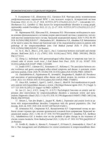 9. Головатенко О.В., Шевкунова Н.А., Гасников И.И. Факторы риска возникновения дисфункциональных нарушений ВНЧС у лиц молодого возраста. Аспирантский вестник Поволжья 2022; 22 (1): 23-27. DOI: 10.55531/2072-2354.2022.22.1.23-27