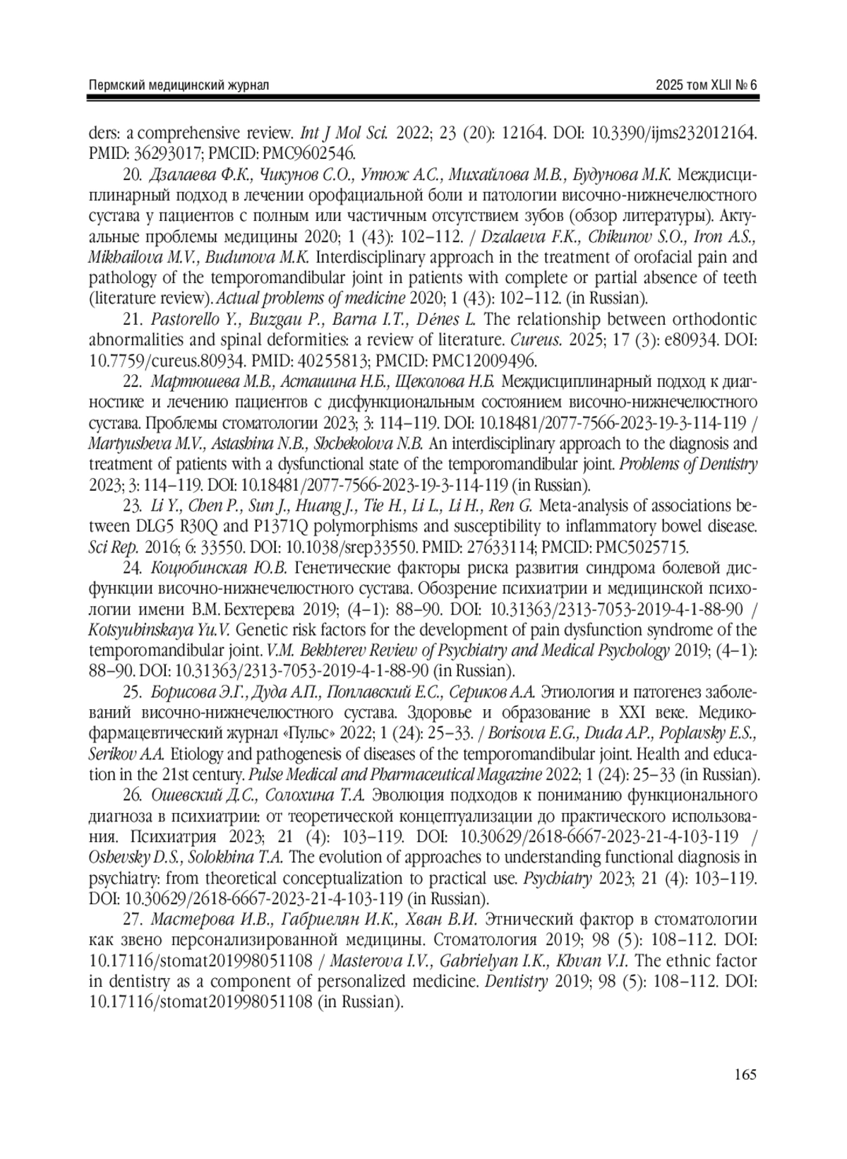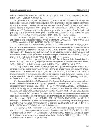 Borisova E.G., Duda A.P., Poplavsky E.S., Serikov A.A. Etiology and pathogenesis of diseases of the temporomandibular joint. Health and education in the 21st century. Pulse Medical and Pharmaceutical Magazine 2022; 1 (24): 25-33 (in Russian).