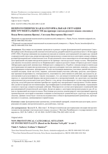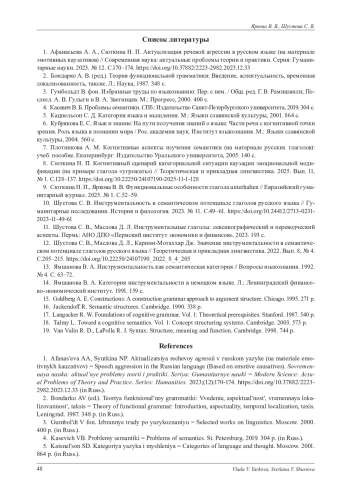 10. Шустова С. В. Инструментальность в семантическом потенциале глаголов русского языка // Гуманитарные исследования. История и филология. 2023. № 11. С.49-61. DOI: 10.24412/2713-0231-2023-11-49-61 EDN: IRXAJT