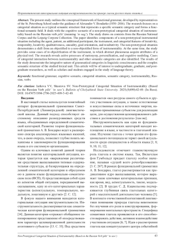 ФУНКЦИОНАЛЬНАЯ ГРАММАТИКА, КОГНИТИВНЫЙ СЦЕНАРИЙ, СЕМАНТИЧЕСКАЯ КАТЕГОРИЯ, КАТЕГОРИАЛЬНАЯ СИТУАЦИЯ, ИНСТРУМЕНТАЛЬНОСТЬ, РУССКИЙ ЯЗЫК, ГЛАГОЛЫ