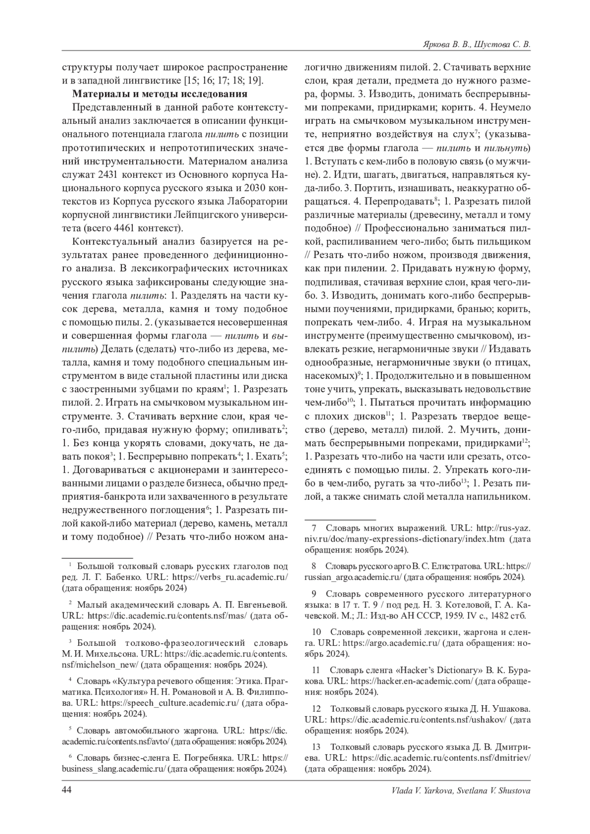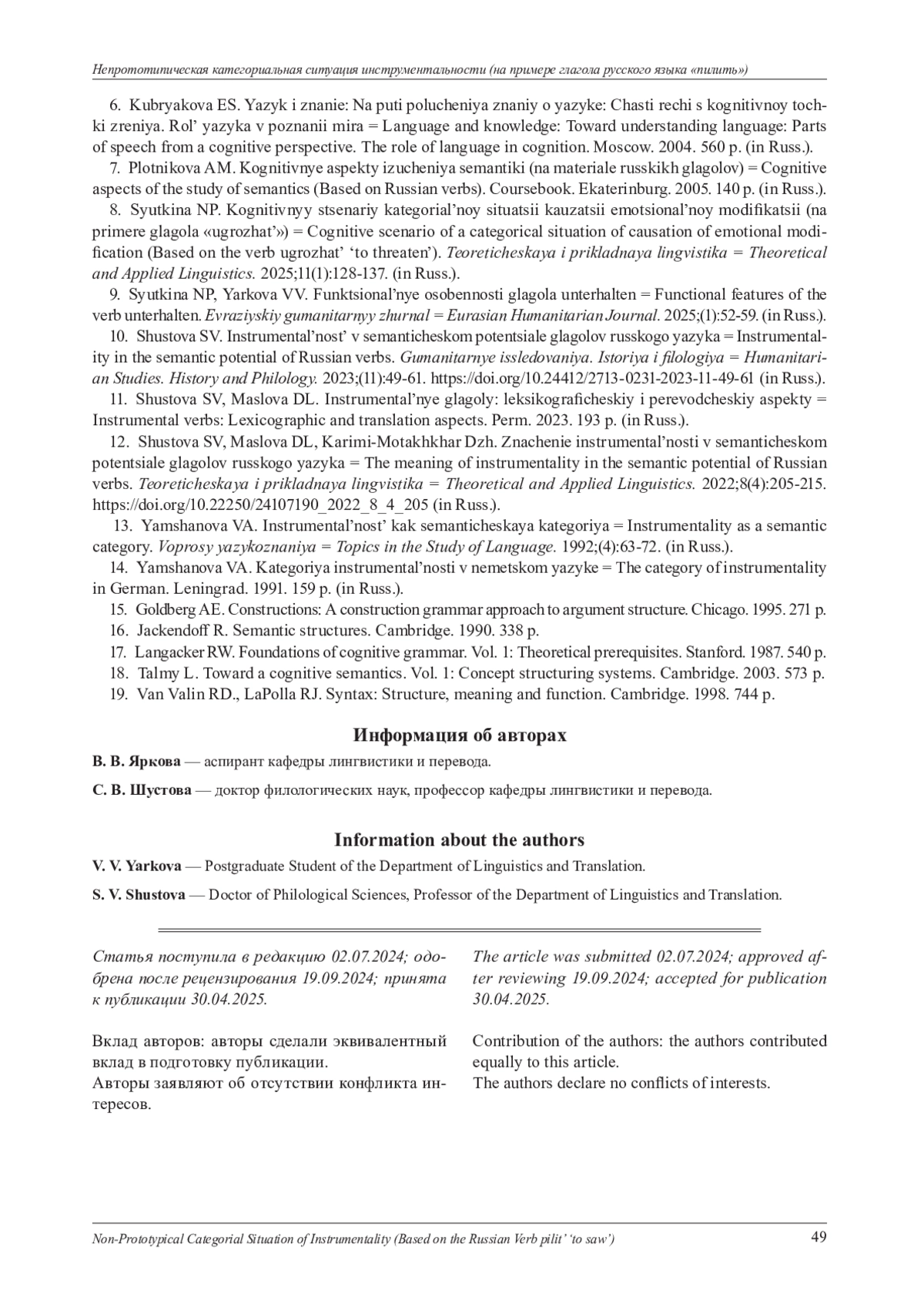 12. Шустова С. В., Маслова Д. Л., Карими-Мотаххар Дж. Значение инструментальности в семантическом потенциале глаголов русского языка // Теоретическая и прикладная лингвистика. 2022. Вып. 8, № 4. С.205-215. DOI: 10.22250/24107190_2022_8_4_205 EDN: ZTGORE