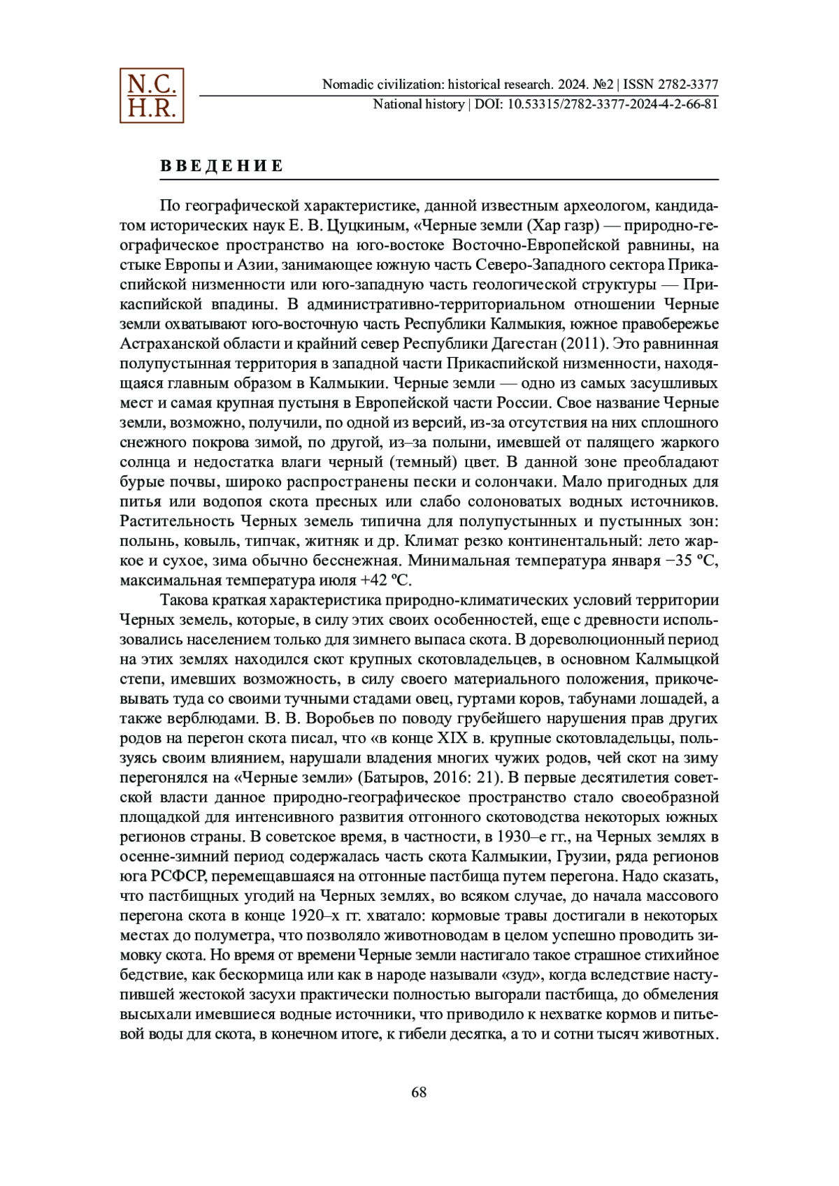 На сегодняшний день изучение истории сельского хозяйства страны и основных ее отраслей в предвоенные годы представляет большой интерес для историков, обществоведов, политологов, что, в свою очередь, обусловлено рядом общественно-политических факторов. Именно в 1930-е гг. СССР окончательно становится страной победившего социализма, где ускоренно проводится индустриализация, реализуется курс на коллективизацию сельского хозяйства. Процесс преобразования сельского хозяйства страны был непростым несмотря на видимую его успешность, изобиловал драматическими событиями и трагическими коллизиями. Вчерашним калмыцким кочевникам пришлось развивать сельскохозяйственное производство в необычайно затруднительных природно-климатических условиях на пустынной и полупустынной территории степного региона — Черных землях. В данной статье нами будет рассмотрена ситуация в Калмыцкой автономной области, сложившаяся в этот период на отгонных пастбищах, когда люди столкнулись с таким природным катаклизмом, как засуха, вызвавшая зуд (бескормицу), тем самым осложнив и без того непростой процесс содержания скота и ухода за ним. Впервые проводится анализ деятельности Центра и местных органов власти, хозяйственных структур в таких экстремальных условиях. Описываются и анализируются конкретные шаги советской власти, направленные на выход из создавшегося критического положения. Результаты исследования дают обширное представление о методах и стиле работы руководителей всех уровней по сохранению общественного поголовья в сложных природно-климатических условиях Черных земель и в чрезвычайной ситуации зуда в осенне-зимний период 1930–1931 гг.