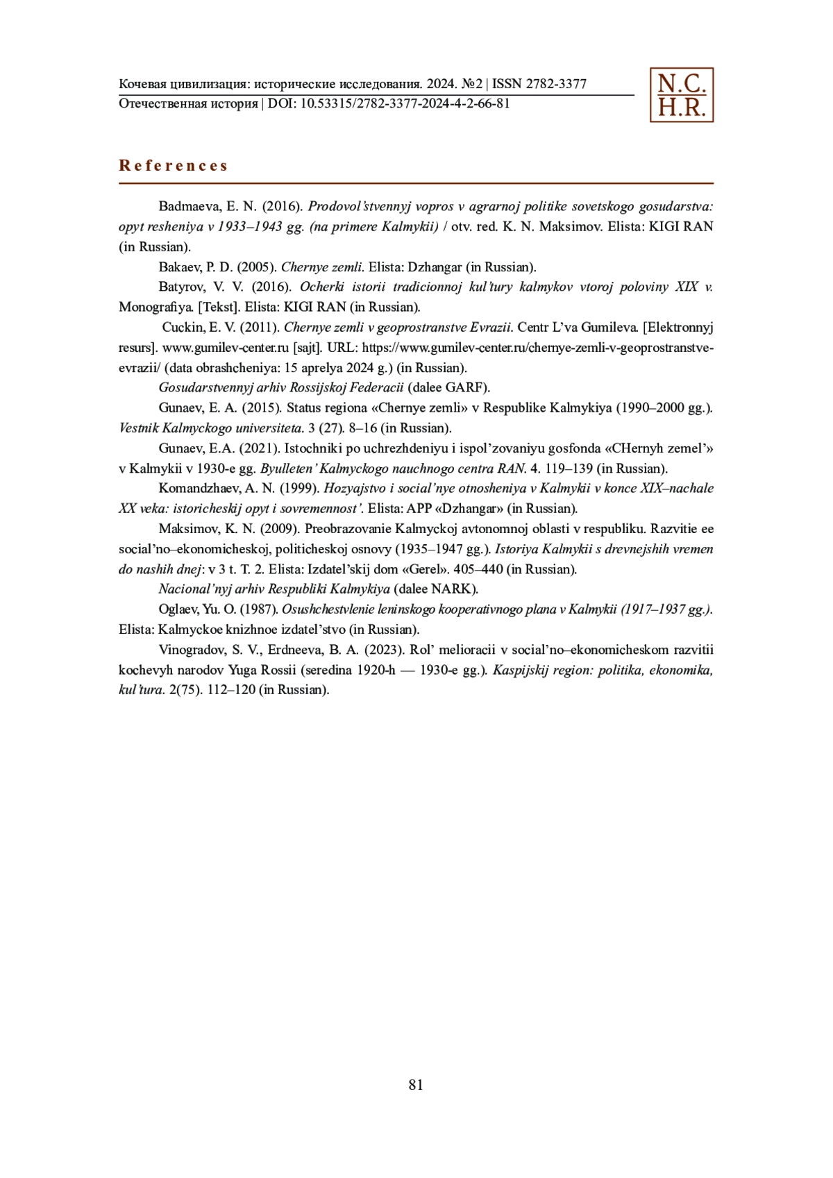 6. Батыров, В. В. (2023а). Адаптационные стратегии калмыков во второй половине процессы перехода к полуоседлому хозяйству. Nomadic Civilization: Historical research. 3. 4. 57-70.