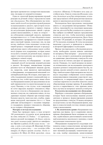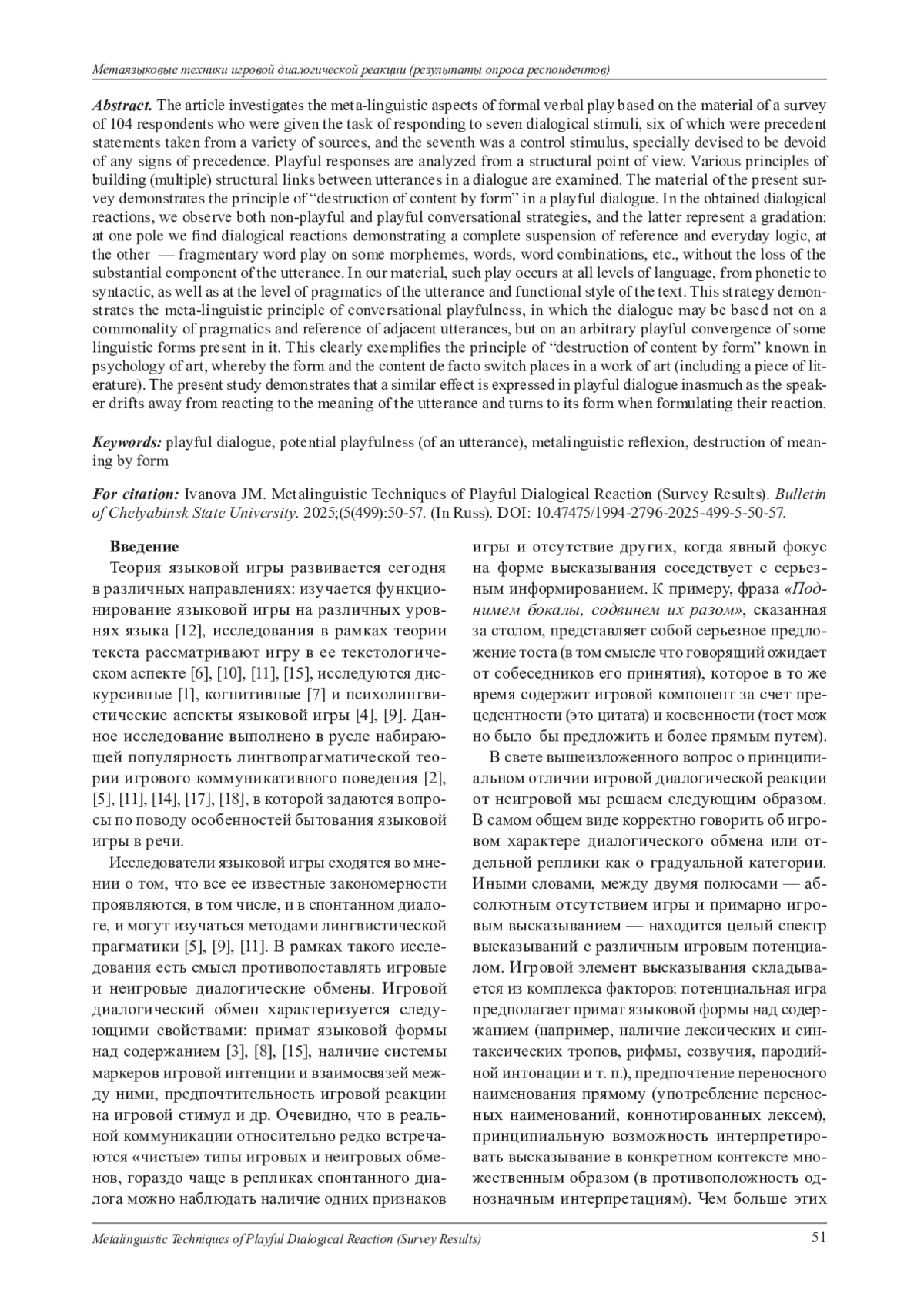 Статья исследует металингвистические аспекты формальной языковой игры на материале опроса 104 респондентов, которым было дано задание отреагировать на семь диалогических стимулов, шесть из которых представляли собой прецедентные высказывания из разных источников, а седьмой являлся контрольным и был лишен любых признаков прецедентности. Игровые реакции анализируются со структурной точки зрения. Различные принципы построения (множественных) структурных связей между высказываниями в диалоге рассматриваются на собранном материале. На материале проведенного опроса демонстрируется принцип «уничтожения содержания формой» игрового диалога. В полученных диалогических реакциях наблюдаются как неигровые, так и игровые конверсационные стратегии, причем последние представляют собой градуальную структуру: на одном ее полюсе находятся диалогические реакции, демонстрирующие полное нарушение референциальных связей и обыденной логики, на другом - фрагментарное обыгрывание некоторых морфем, слов, словосочетаний и т. п. при сохранении серьезного компонента высказывания. В нашем материале такое обыгрывание происходит на всех уровнях языка, от фонетического до синтаксического, а также на уровне прагматики высказывания и функционального стиля текста. Такая стратегия демонстрирует метаязыковой принцип речевой игры, при котором информационной основой диалога может стать не общность прагматики и референции смежных высказываний в диалоге, а произвольное игровое сближение некоторых языковых форм в их составе. Этот принцип наглядно демонстрирует то, что в психологии искусства называется принципом «уничтожения содержания формой», когда в художественном произведении (в том числе и литературном) форма и содержание меняются местами. По результатам настоящего исследования похожий эффект выражен в игровом диалоге тем сильнее, чем в большей степени говорящий при формулировке своего ответа отвлекается от смысла высказывания и обращается к его форме.