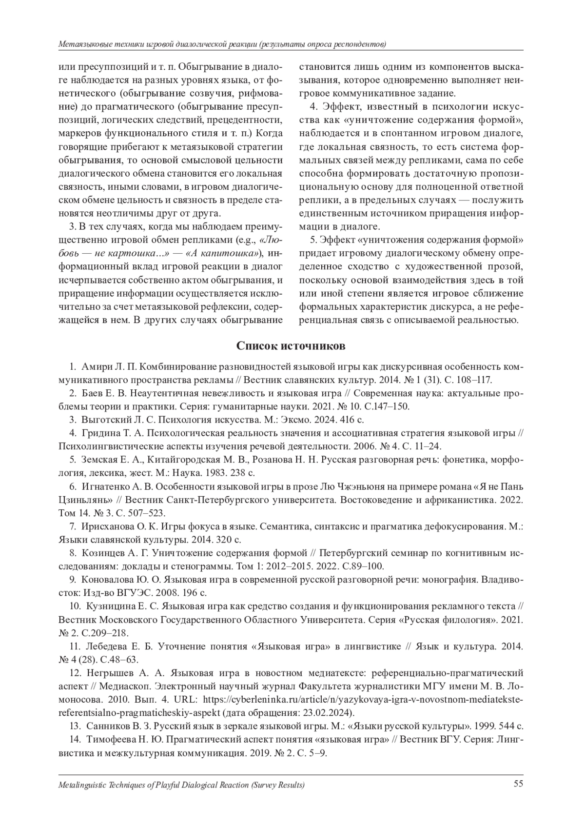 12. Негрышев А. А. Языковая игра в новостном медиатексте: референциально-прагматический аспект // Медиаскоп. Электронный научный журнал Факультета журналистики МГУ имени М. В. Ломоносова. 2010. Вып. 4. URL: https://cyberleninka.ru/article/n/yazykovaya-igra-v-novostnom-mediatekste-referentsialno-pragmaticheskiy-aspekt (дата обращения: 23.02.2024).