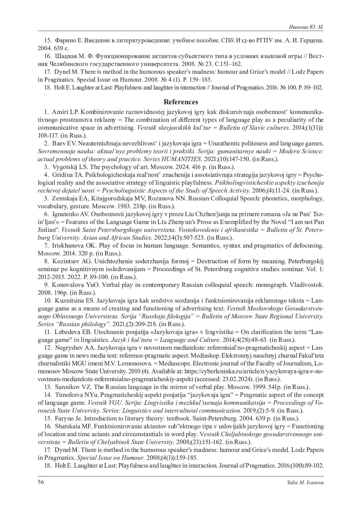 14. Тимофеева Н. Ю. Прагматический аспект понятия “языковая игра” // Вестник ВГУ. Серия: Лингвистика и межкультурная коммуникация. 2019. № 2. С. 5-9.