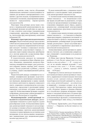 3. Горбачева Е. Н., Фокина Ю. М., Календр А. А. Прагмалингвистические характеристики педагогических стилей общения (на примере англоязычного педагогического дискурса) // Гуманитарные исследования. 2020. № 4. С. 30-37. EDN: ZAPPJI