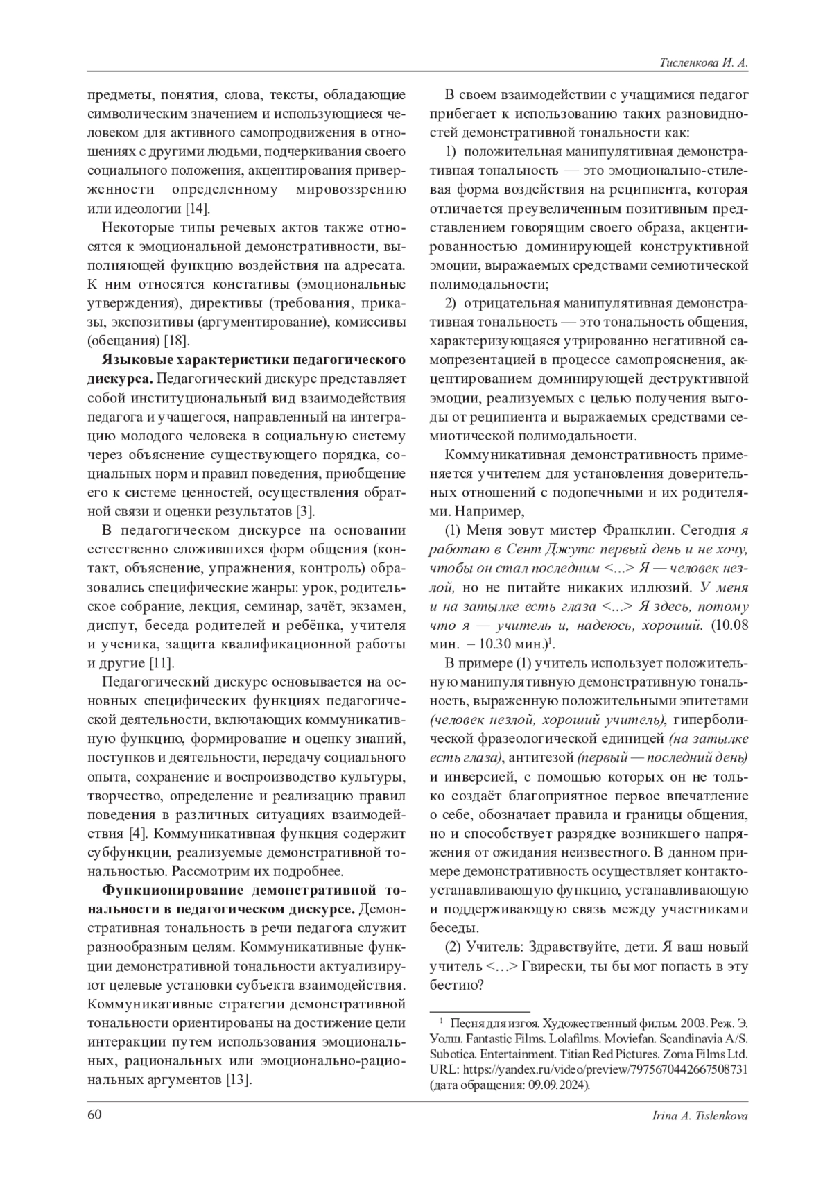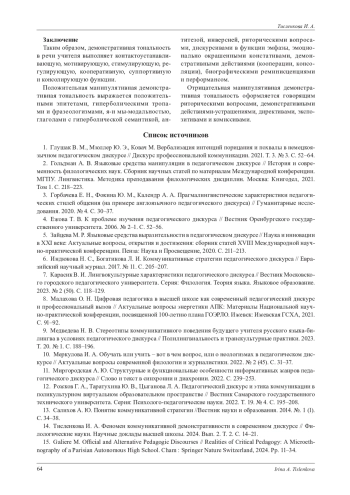 14. Тисленкова И. А. Феномен коммуникативной демонстративности в современном дискурсе // Филологические науки. Научные доклады высшей школы. 2024. Вып. 2. Т. 2. С. 14-21. EDN: RFSEOI