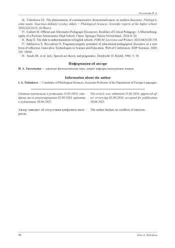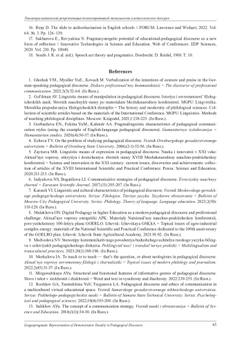 17. Sakharova E., Revyakina N. Pragmasynergetic potential of educational-pedagogical discourse as a new form of reflection // Innovative Technologies in Science and Education. Web of Conferences. EDP Sciences, 2020. Vol. 210. Pp. 18040. EDN: TMZVVN